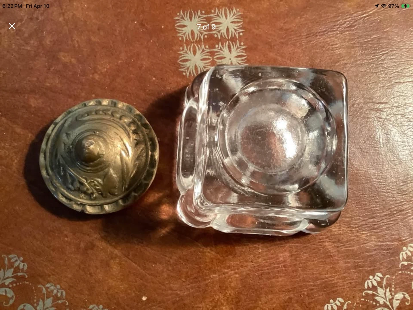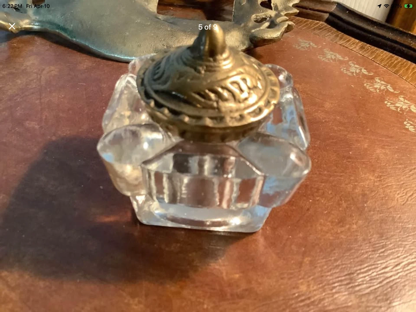The inkwell is approximately 2 1/3” wide, 1 1/3” deep and 2.5” tall including the brass lid.