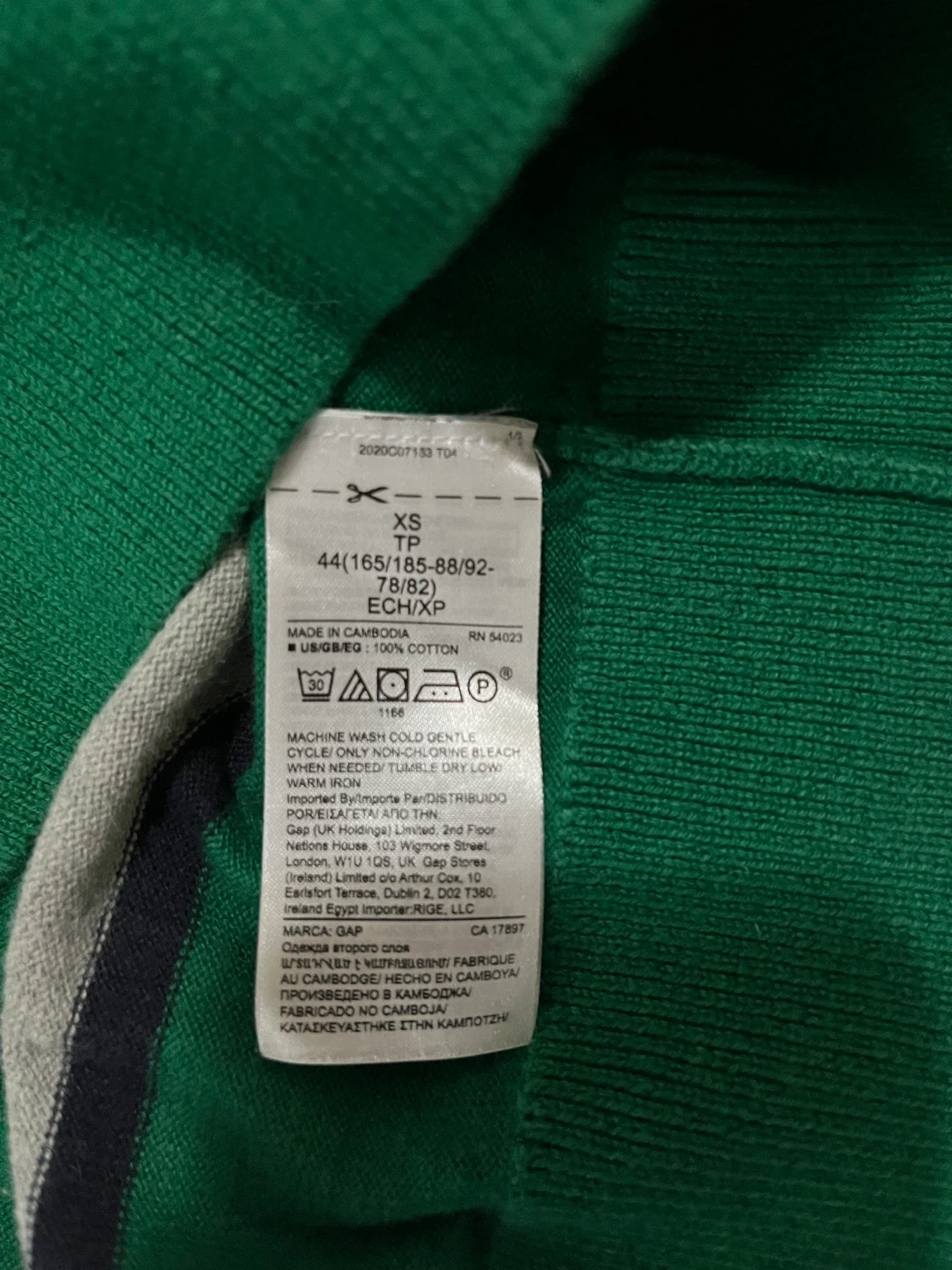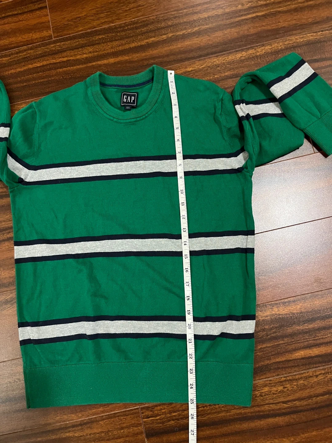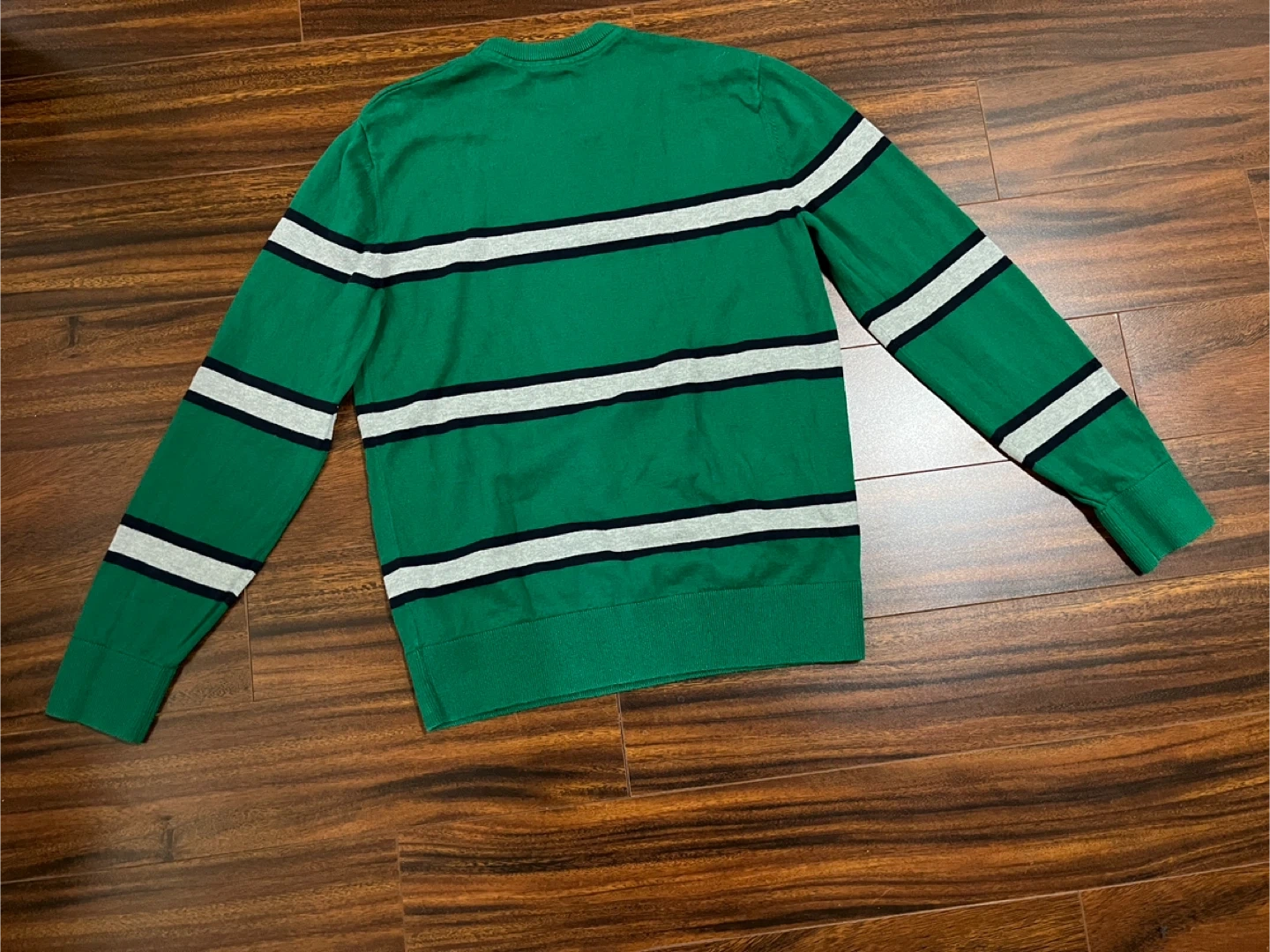 Men’s Gap Mainstay Crew sweater in green with white and navy horizontal stripes. 100% cotton with ribbed cuffs hem and collar. Excellent condition. Smoke-free home.