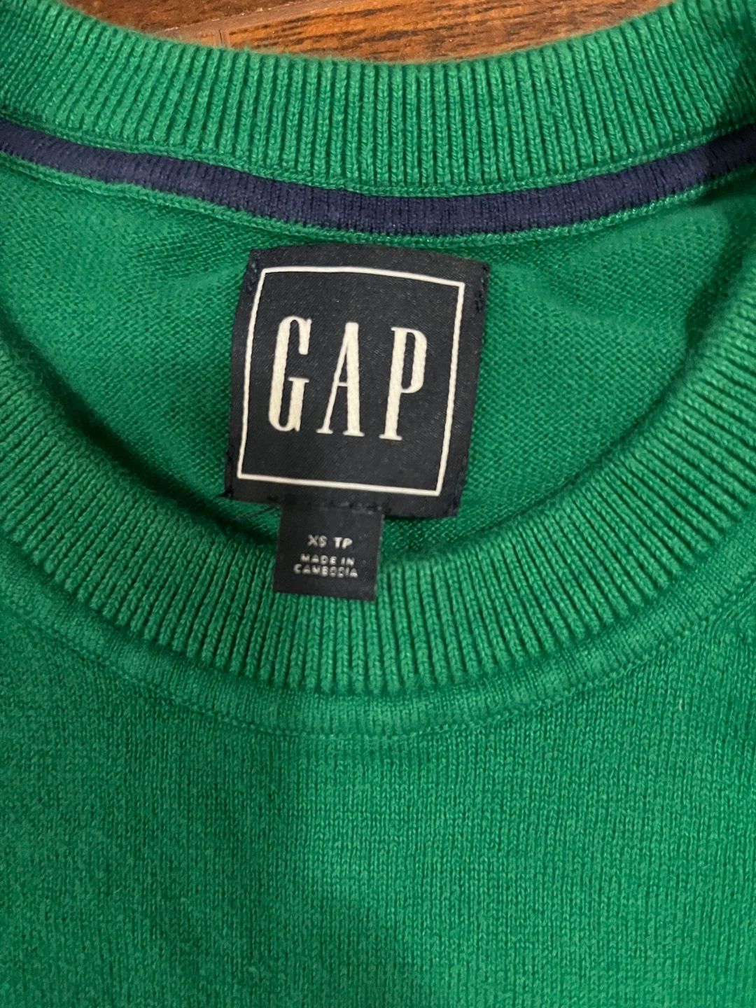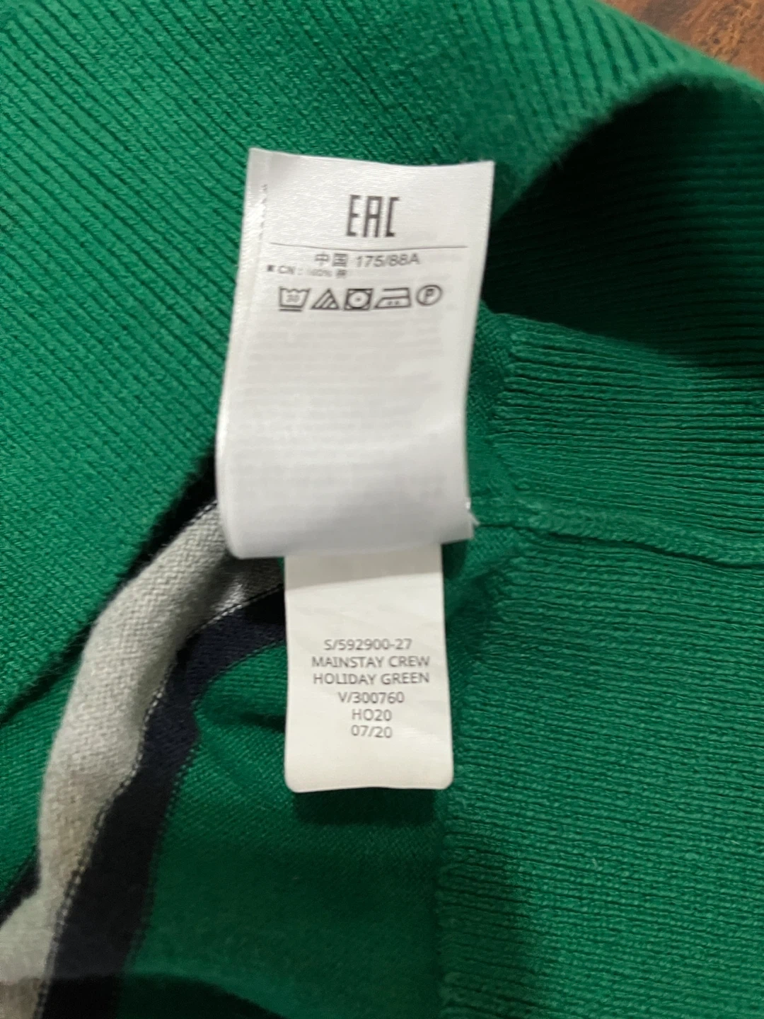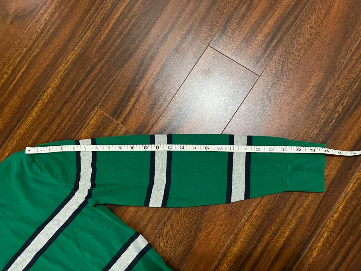 Men’s Gap Mainstay Crew sweater in green with white and navy horizontal stripes. 100% cotton with ribbed cuffs hem and collar. Excellent condition. Smoke-free home.