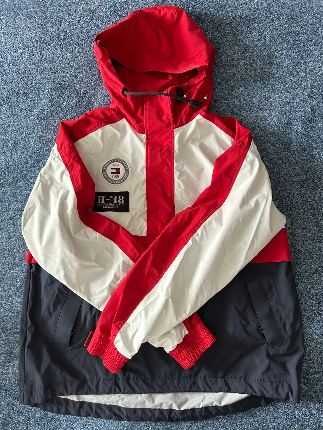Tommy Hilfiger jacket with red, white, and navy panels. It features a hood and zippered pockets. It's a great piece for cooler weather!