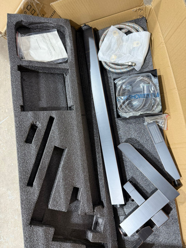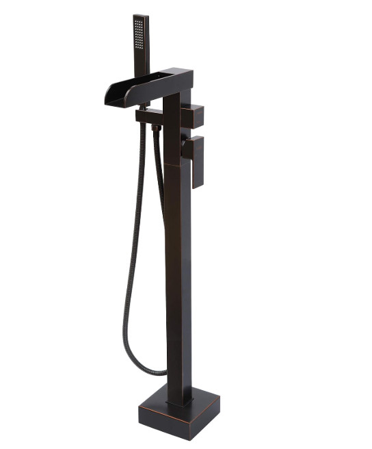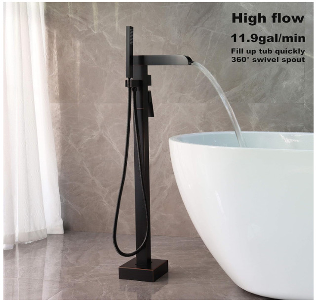 Freestanding Bathtub Faucet – Oil-Rubbed Bronze | Waterfall with Handheld Shower. Final sale – no returns, no warranty. Check and test on pickup. Luxurious waterfall-style freestanding tub filler in a beautiful oil-rubbed bronze finish. Floor-mounted with a high 11.9GAL flow rate for quick filling. Includes handheld shower for added flexibility.