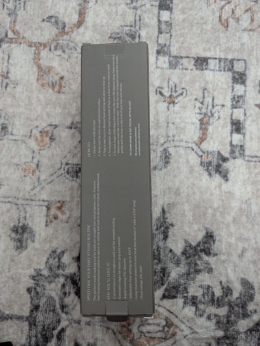 This is the Complex Culture Titanium Styling Flat Iron, designed for perfect smooth hair and gorgeous curls. It features fast heating titanium plates for optimal styling. The plates measure 1" wide x 3.75" long.