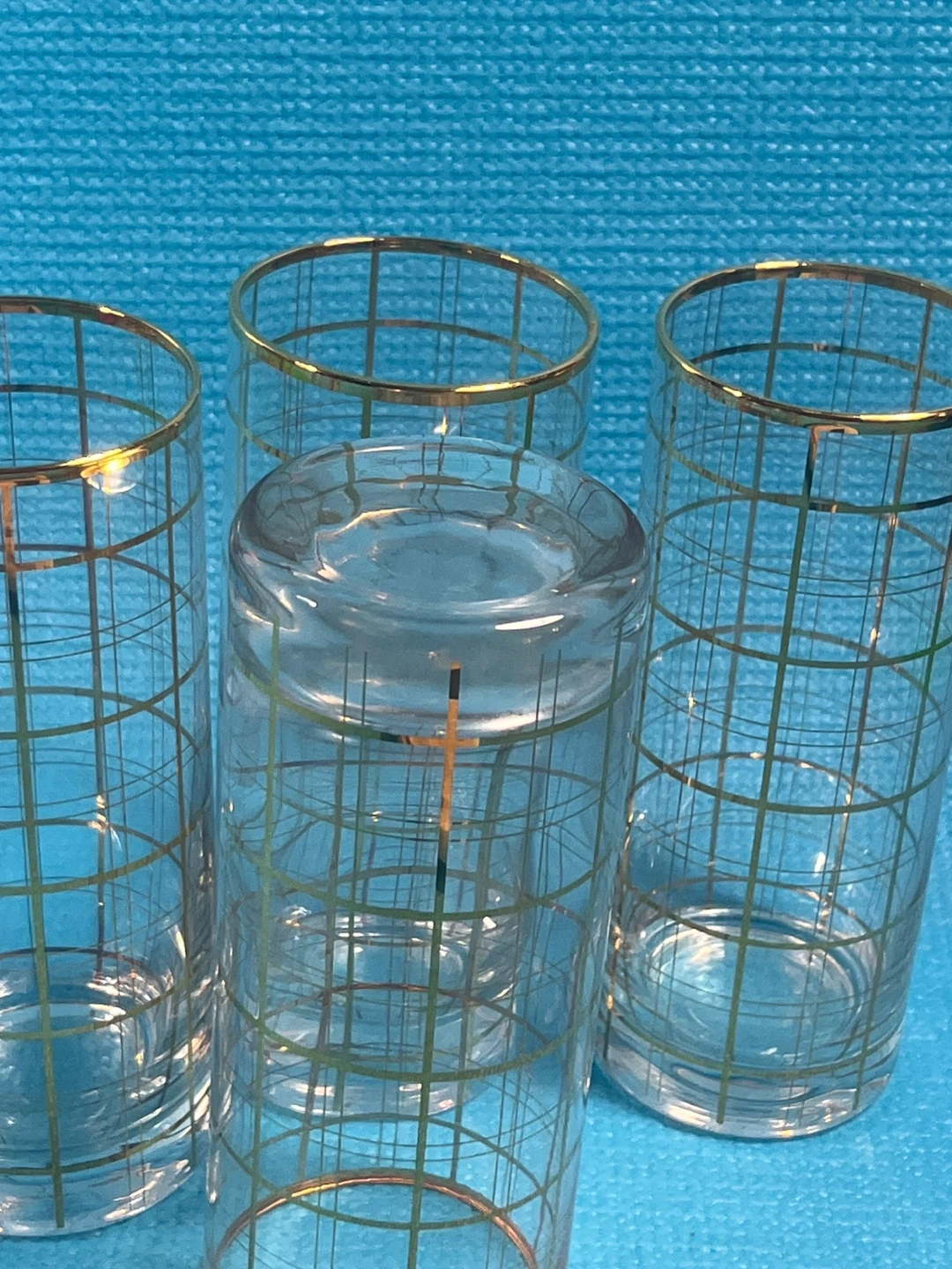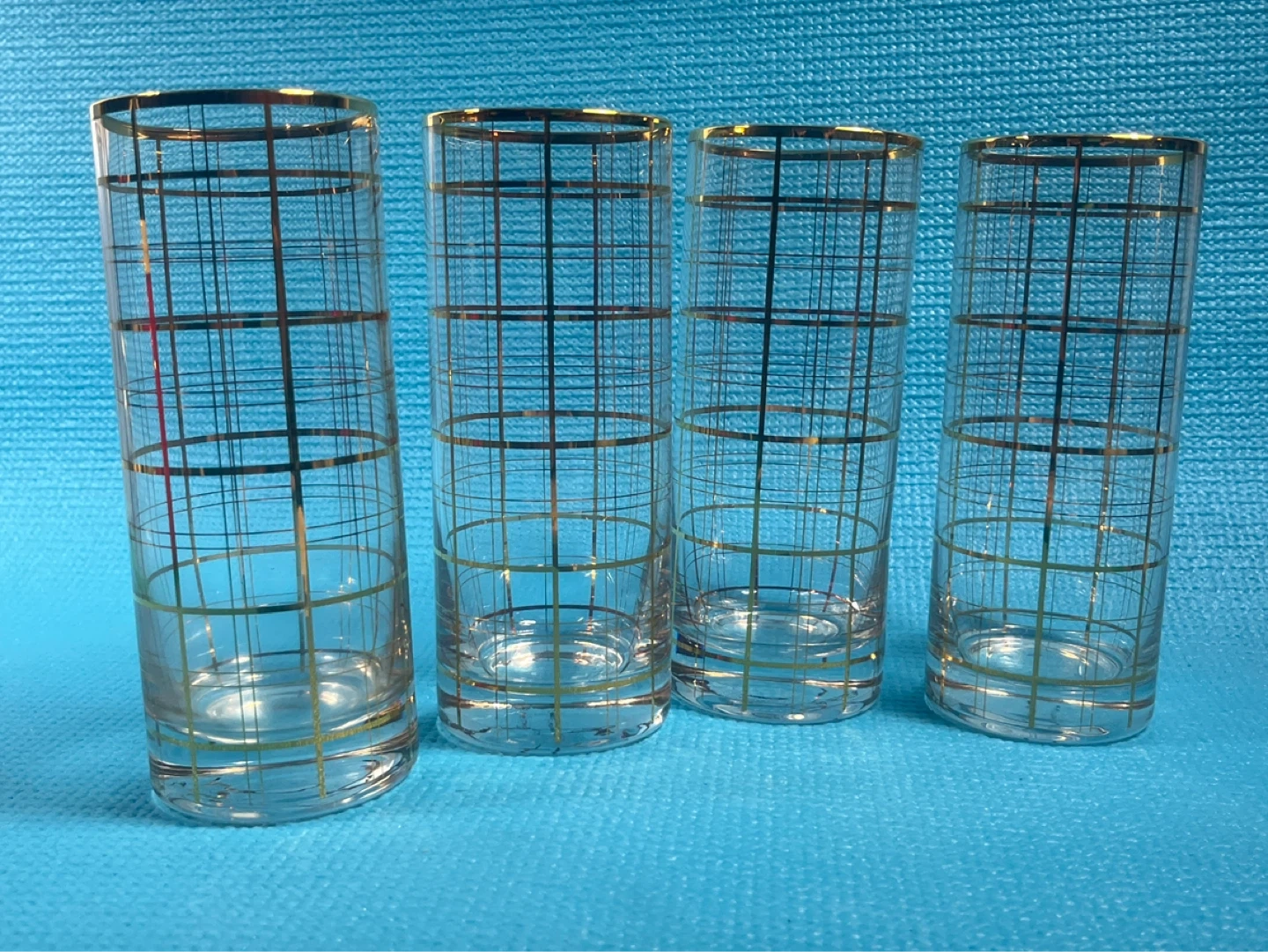 Elevate your home bar with this stunning set of 4 vintage highball glasses. These feature a heavy-weighted base and a classic 22k gold grid "windowpane" pattern that perfectly captures the 1960s Madison Avenue "Mad Men" aesthetic.
