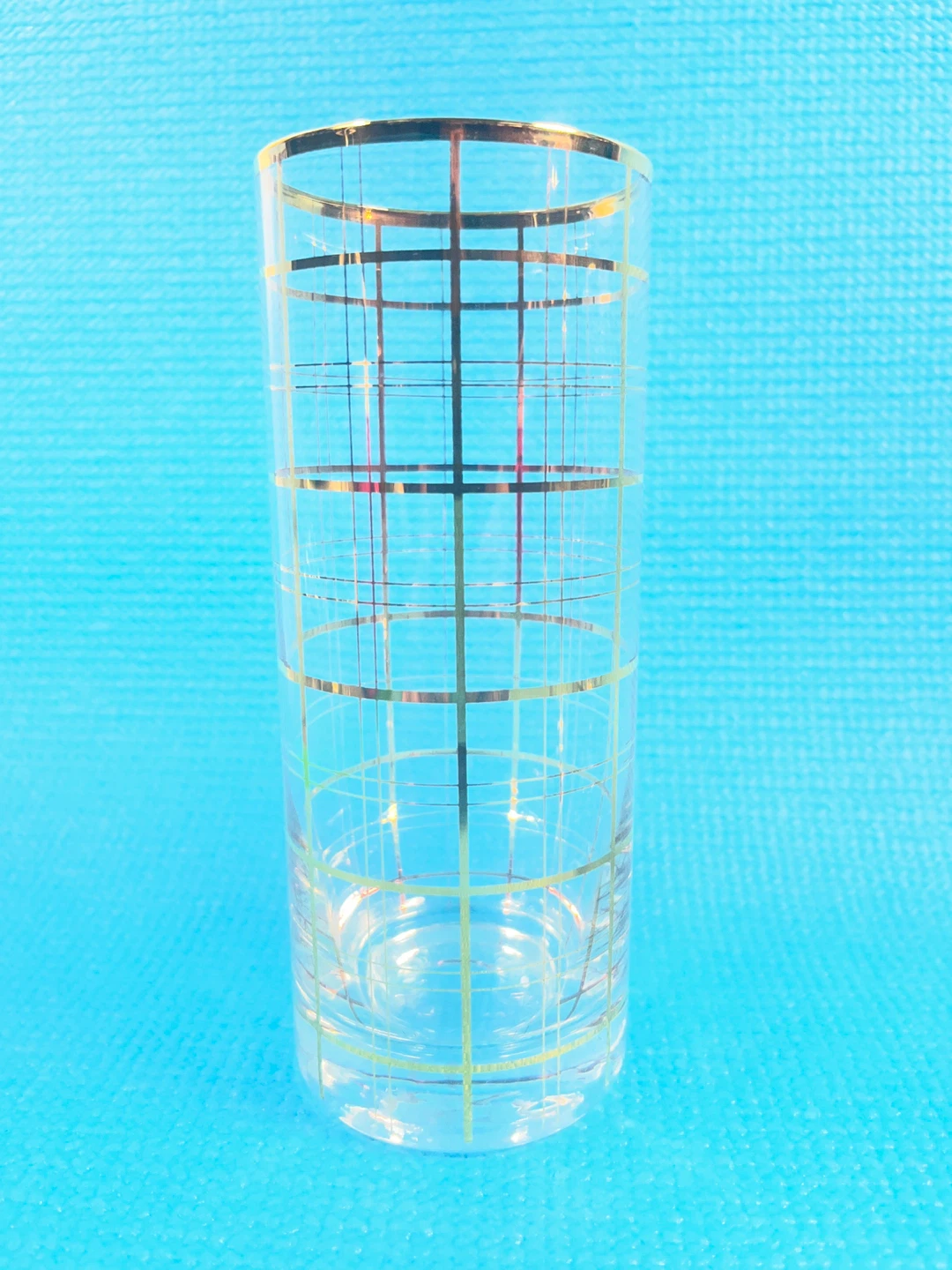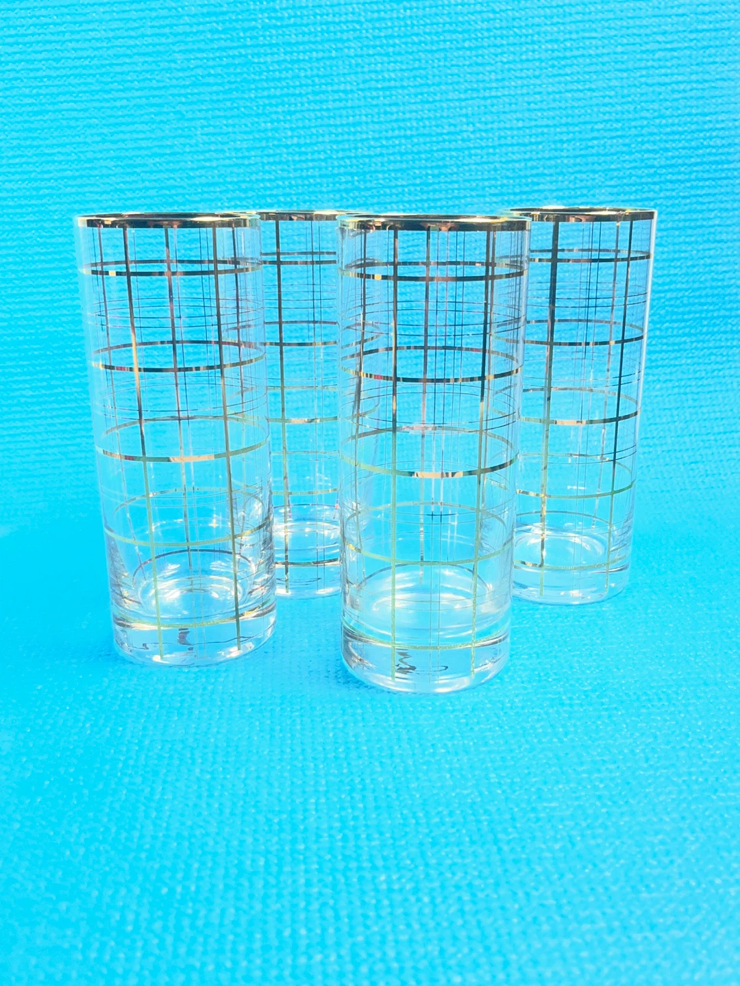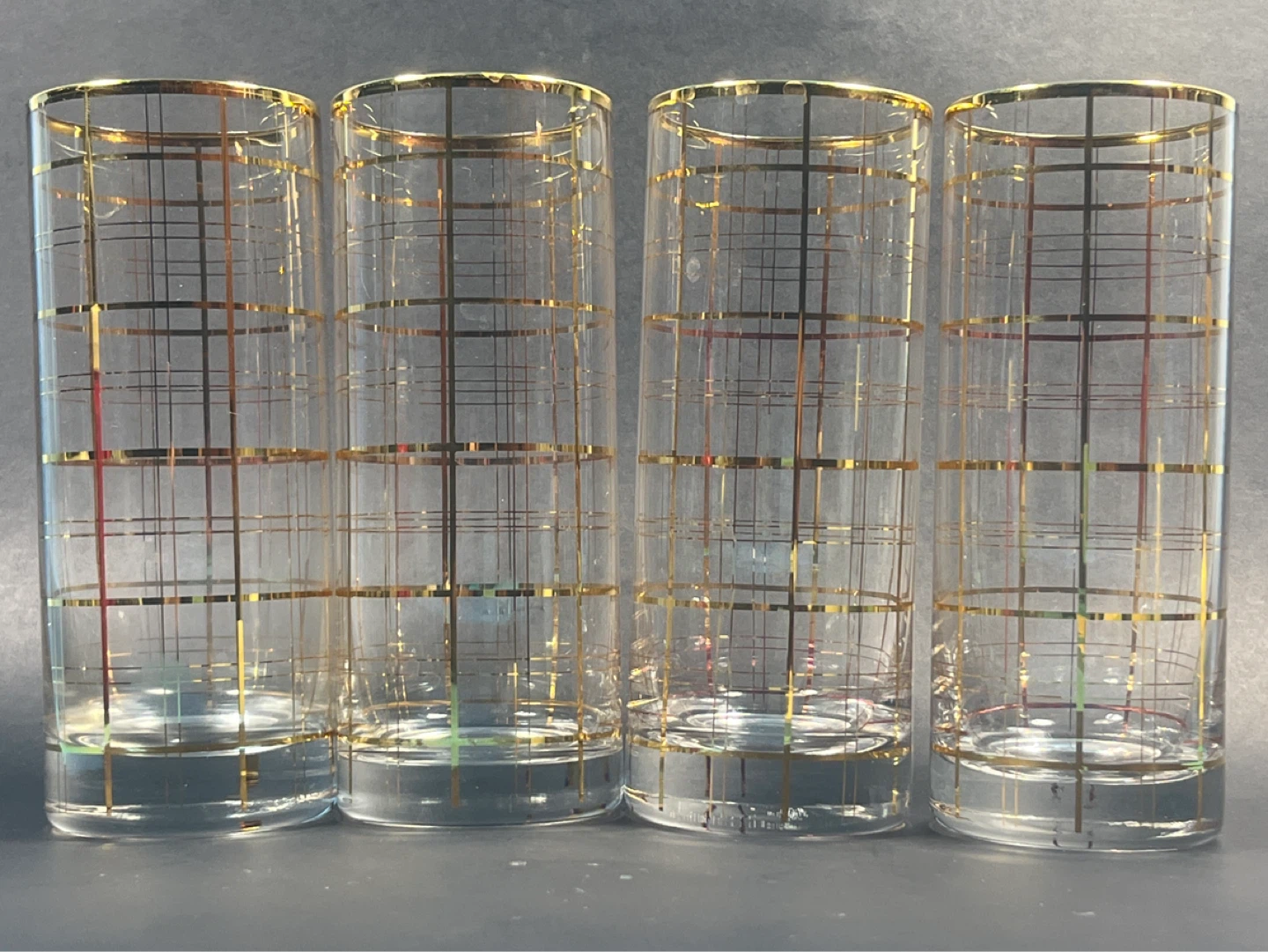 Elevate your home bar with this stunning set of 4 vintage highball glasses. These feature a heavy-weighted base and a classic 22k gold grid "windowpane" pattern that perfectly captures the 1960s Madison Avenue "Mad Men" aesthetic.