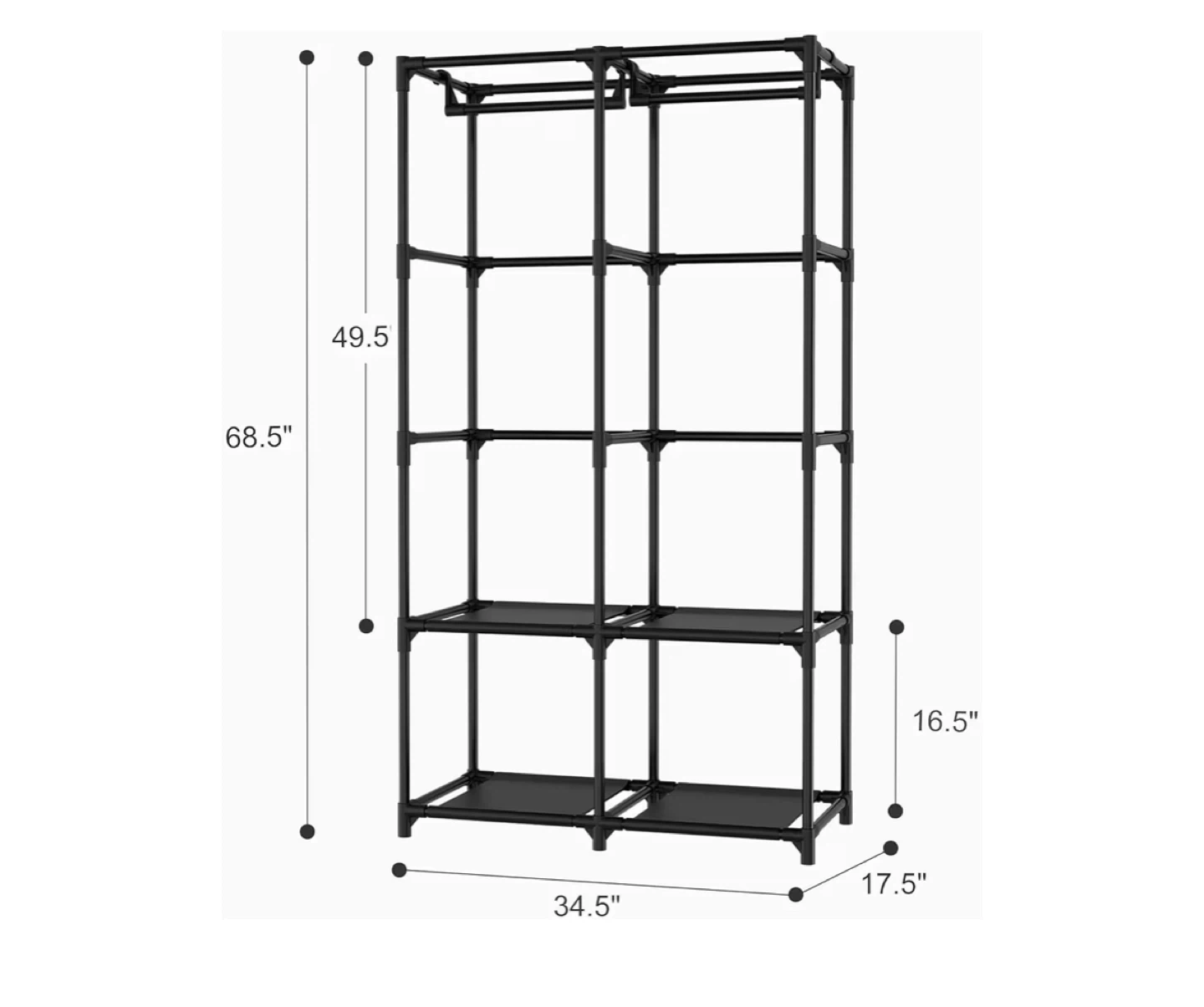Organize your clothes with this portable closet wardrobe! It features removable covers, sturdy metal tubes, and high-quality connectors. It also has a zipper closure, hook and loop fastener, and a waterproof fabric cover. The wardrobe includes 8 side pockets for extra storage. Dimensions: 68.5" x 34.5" x 17.5"