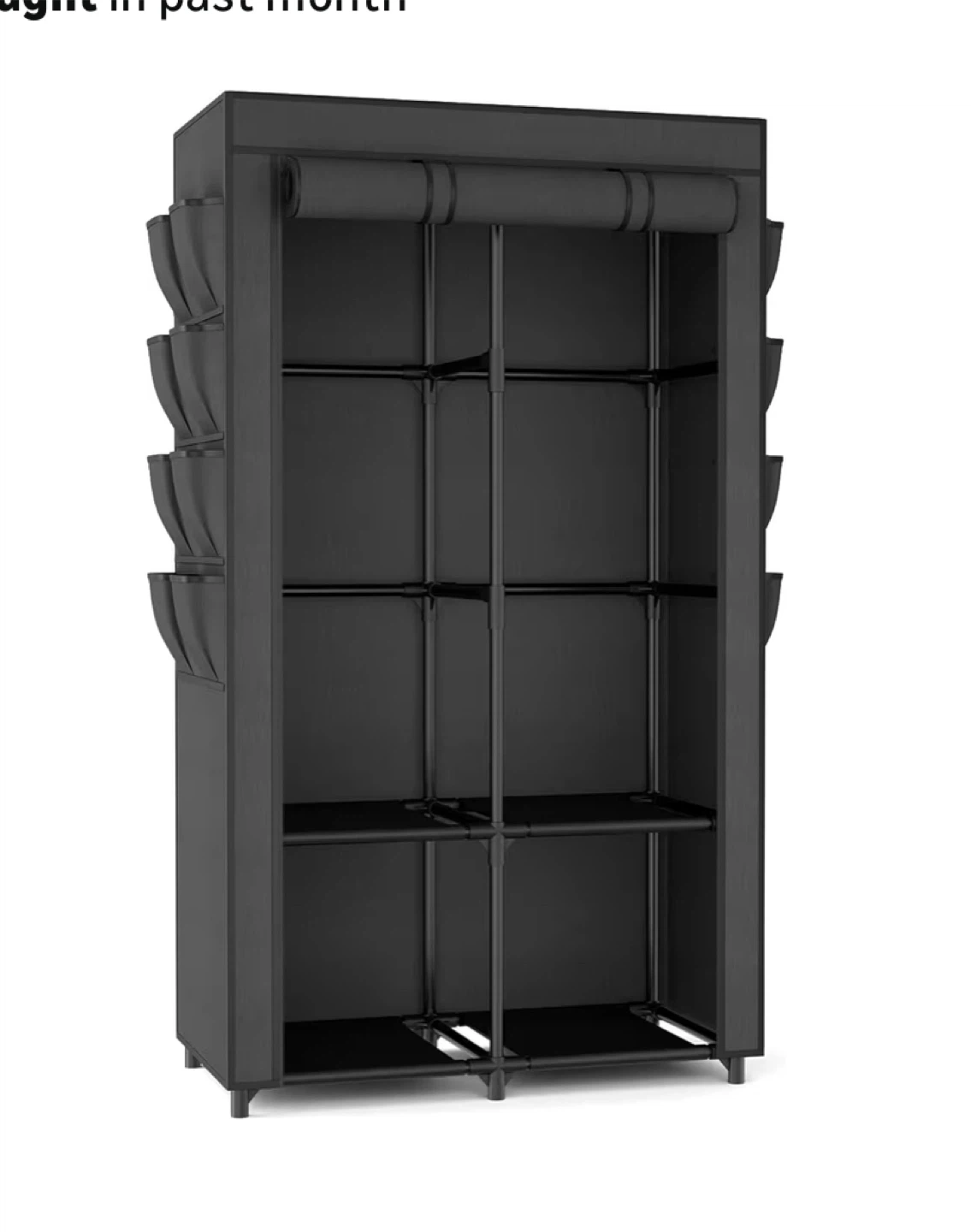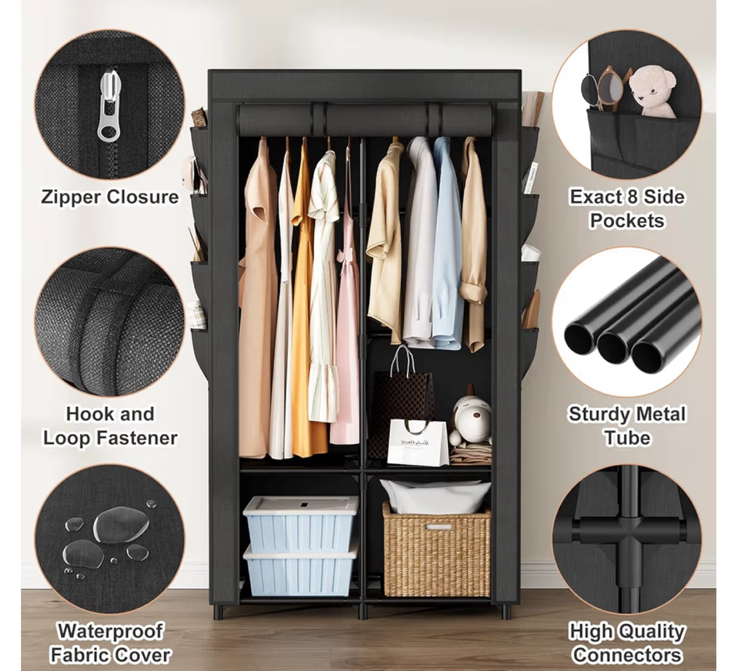 Organize your clothes with this portable closet wardrobe! It features removable covers, sturdy metal tubes, and high-quality connectors. It also has a zipper closure, hook and loop fastener, and a waterproof fabric cover. The wardrobe includes 8 side pockets for extra storage. Dimensions: 68.5" x 34.5" x 17.5"