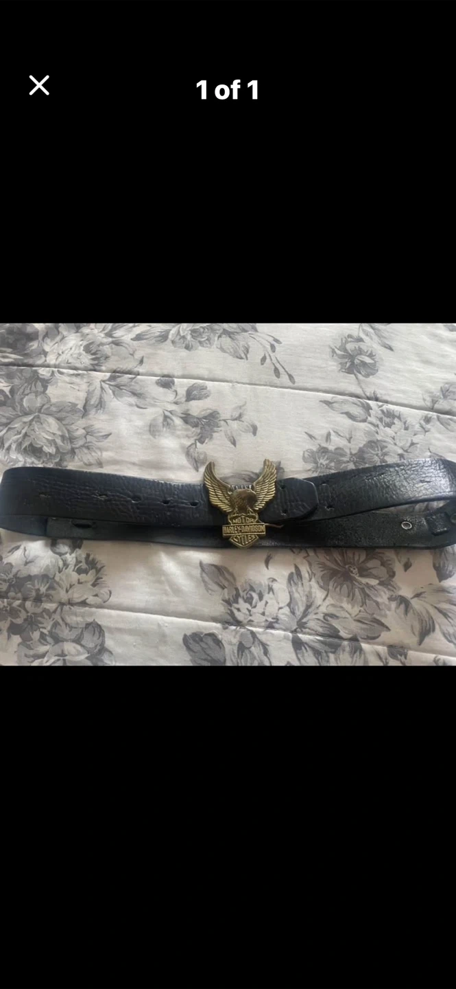 Black leather belt featuring a prominent brass-toned eagle buckle with the Harley-Davidson logo. It's a stylish accessory for any motorcycle enthusiast. Belt material is leather.