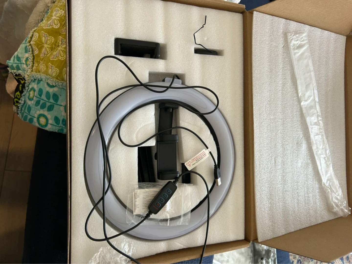 This 10" cantilever bracket lamp is a ring light with adjustable brightness. It comes with a phone holder and a cable with inline controls. Great for content creators or anyone needing better lighting!