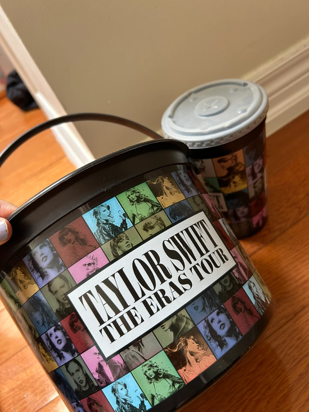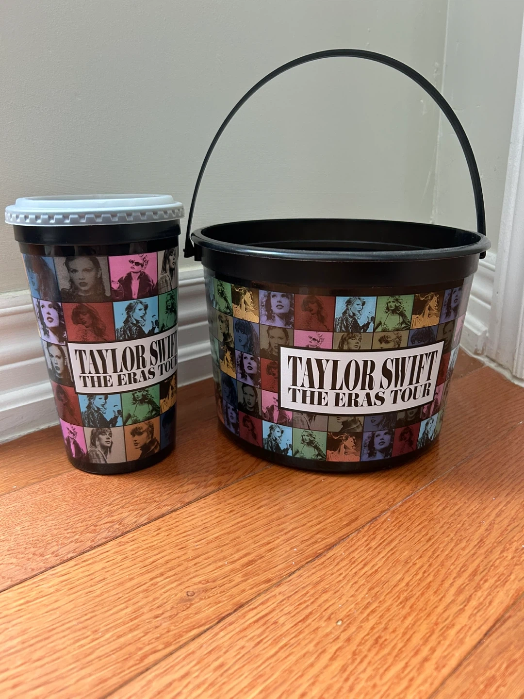 Two Taylor Swift The Eras Tour promotional items from cinaplex. Includes a cup and a bucket with a handle.