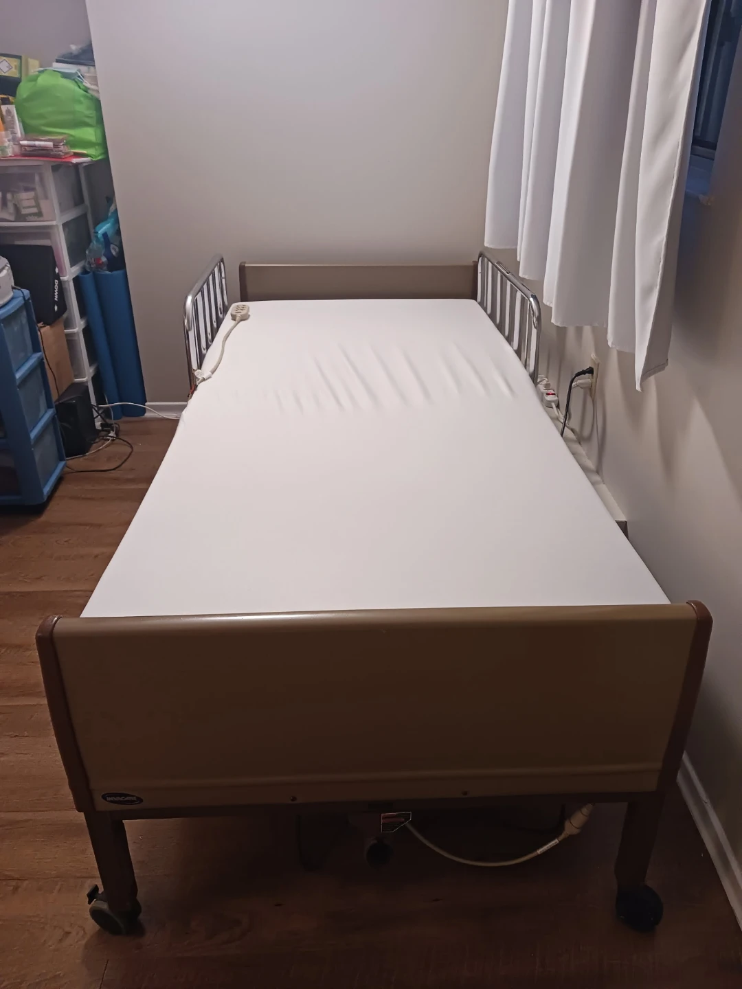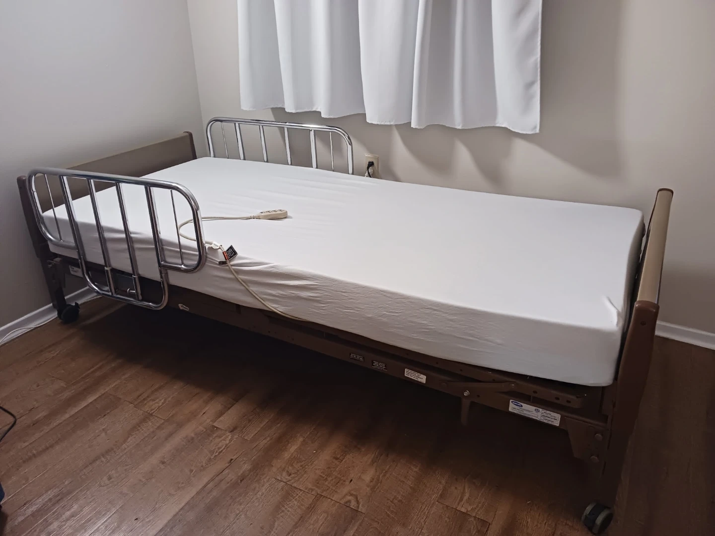 Invacare electric hospital bed with side rails. Comes with a mattress and controller for adjusting bed position. This bed is suitable for home care needs or recovery.