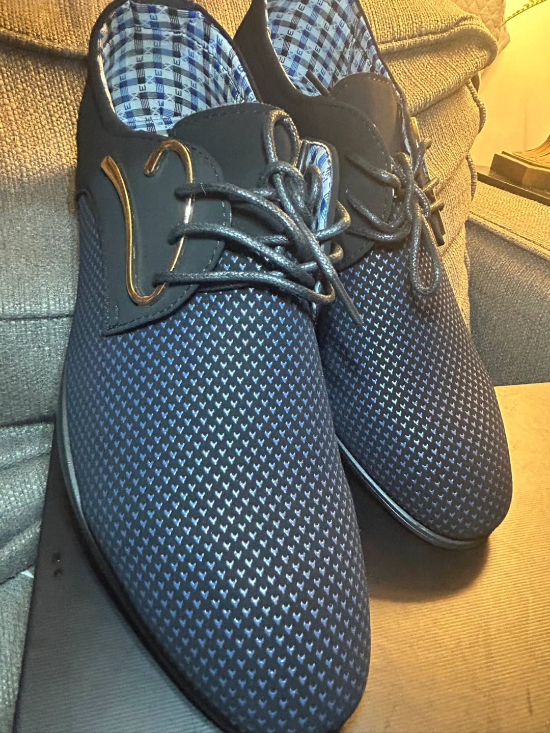 Pair of men's dress shoes. Grey patterned fabric upper. Black synthetic leather accents. Lace-up closure. Rubber sole. Size 9.5 (44). One pair only.