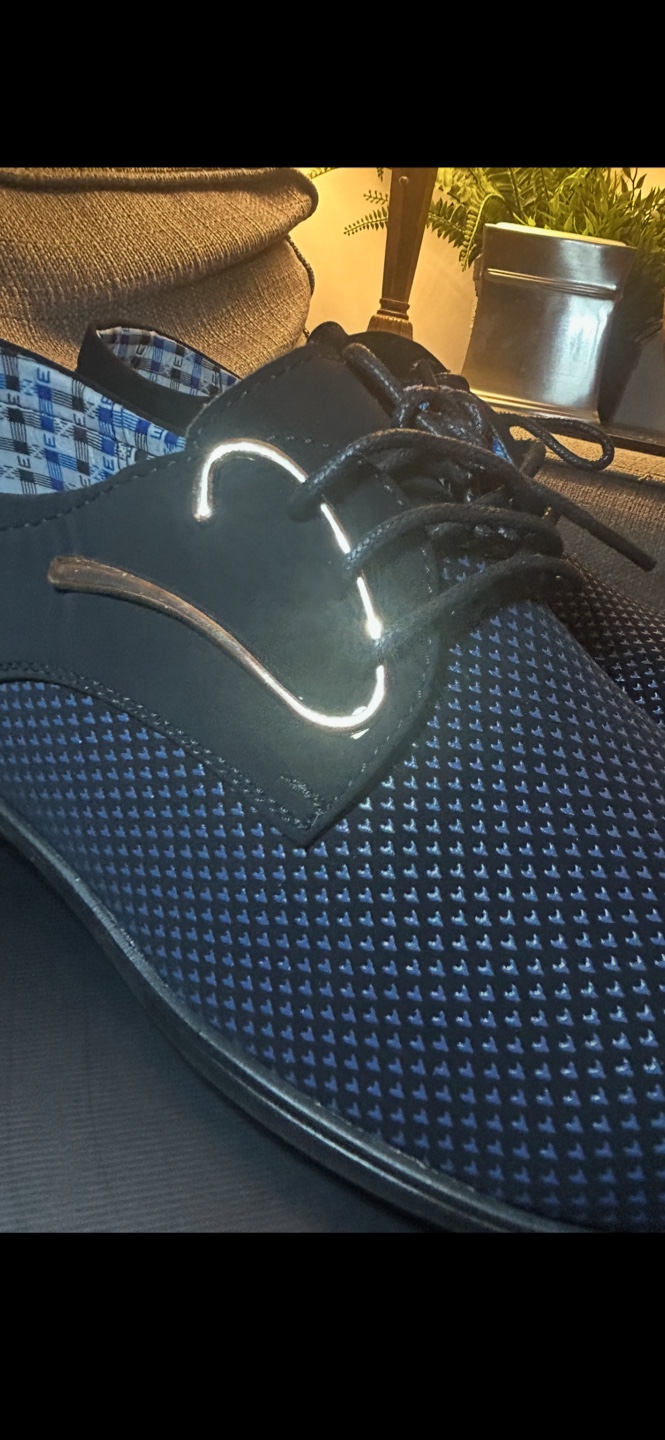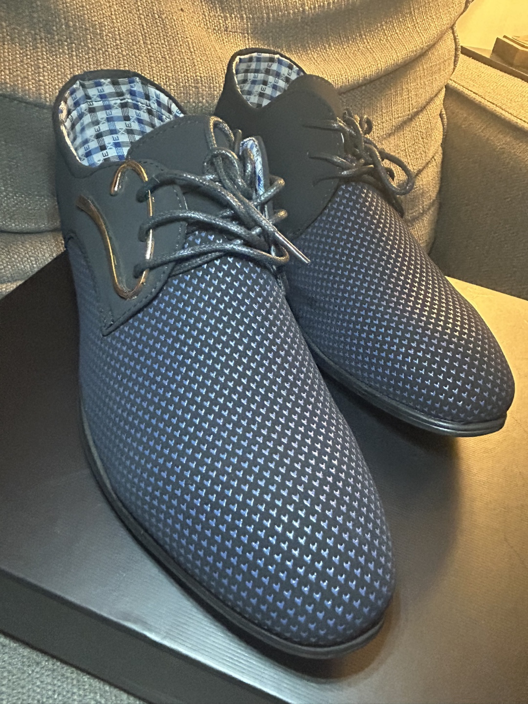 Pair of men's dress shoes. Grey patterned fabric upper. Black synthetic leather accents. Lace-up closure. Rubber sole. Size 9.5 (44). One pair only.
