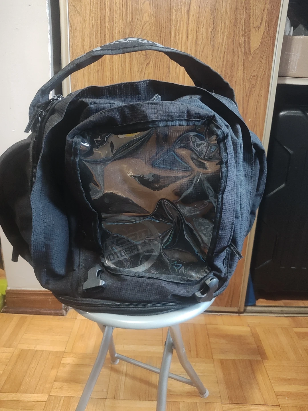 Black Icon motorcycle backpack with a clear top pocket for maps or devices. It features adjustable straps and multiple compartments for storage. This bag's design is great for riders needing easy access to navigation while on the go.