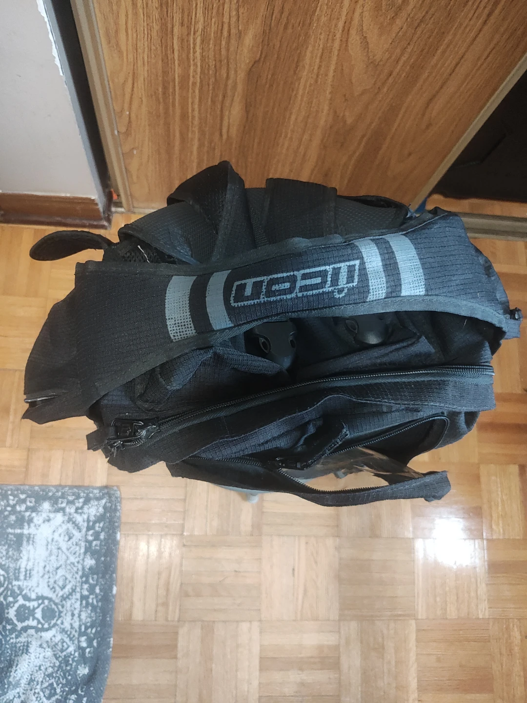 Black Icon motorcycle backpack with a clear top pocket for maps or devices. It features adjustable straps and multiple compartments for storage. This bag's design is great for riders needing easy access to navigation while on the go.