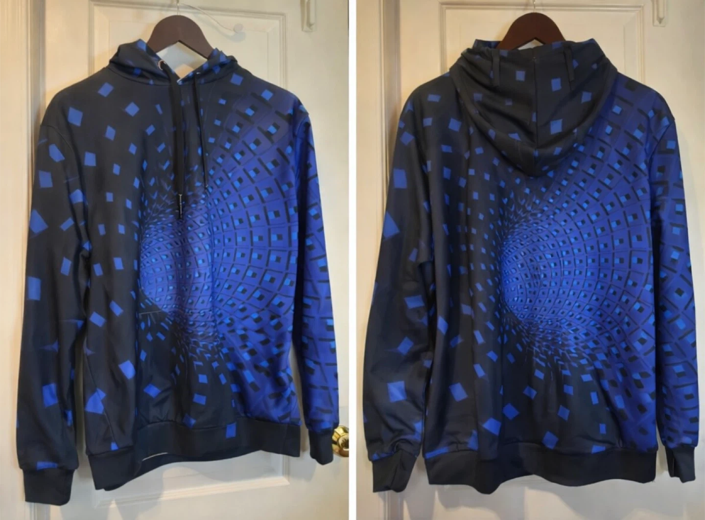 This is a men's graphic print hoodie with a black and blue vortex design. It's a pullover style with a hood and long sleeves. The material appears to be a polyester blend, common for activewear or fashion hoodies.