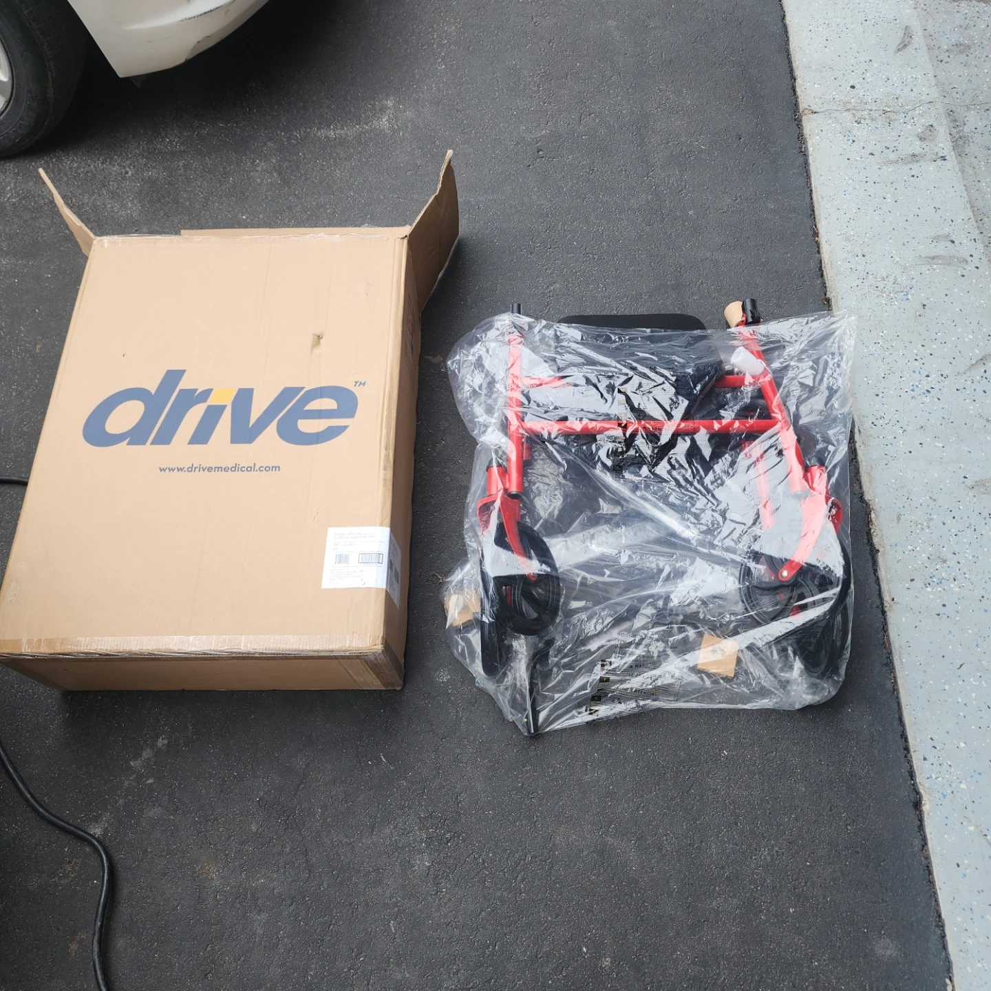 This Drive Medical folding walker is red. It comes in its original box. It's designed for easy portability and storage.