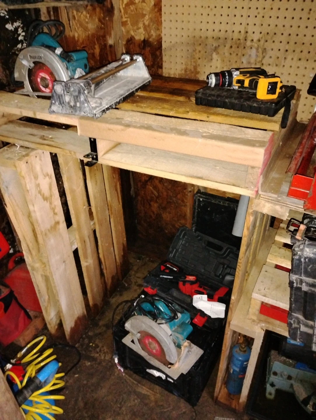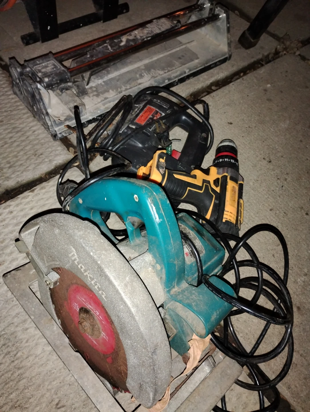 Includes a Makita circular saw, a yellow and black drill, a black jigsaw, and a tile cutter. Also includes a variety of drill bits and a staple gun.