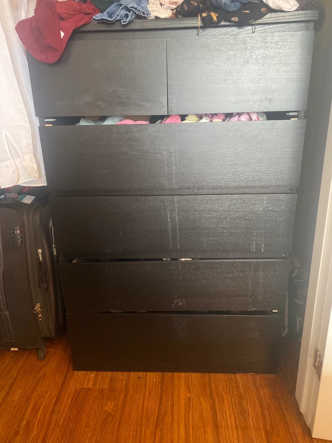 This black dresser has six drawers for ample storage. The wood laminate finish gives it a modern look. It's a sturdy piece of furniture that would work well in a bedroom or closet.