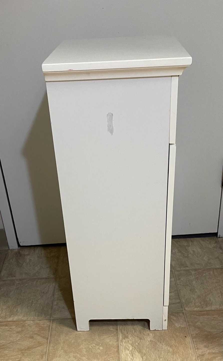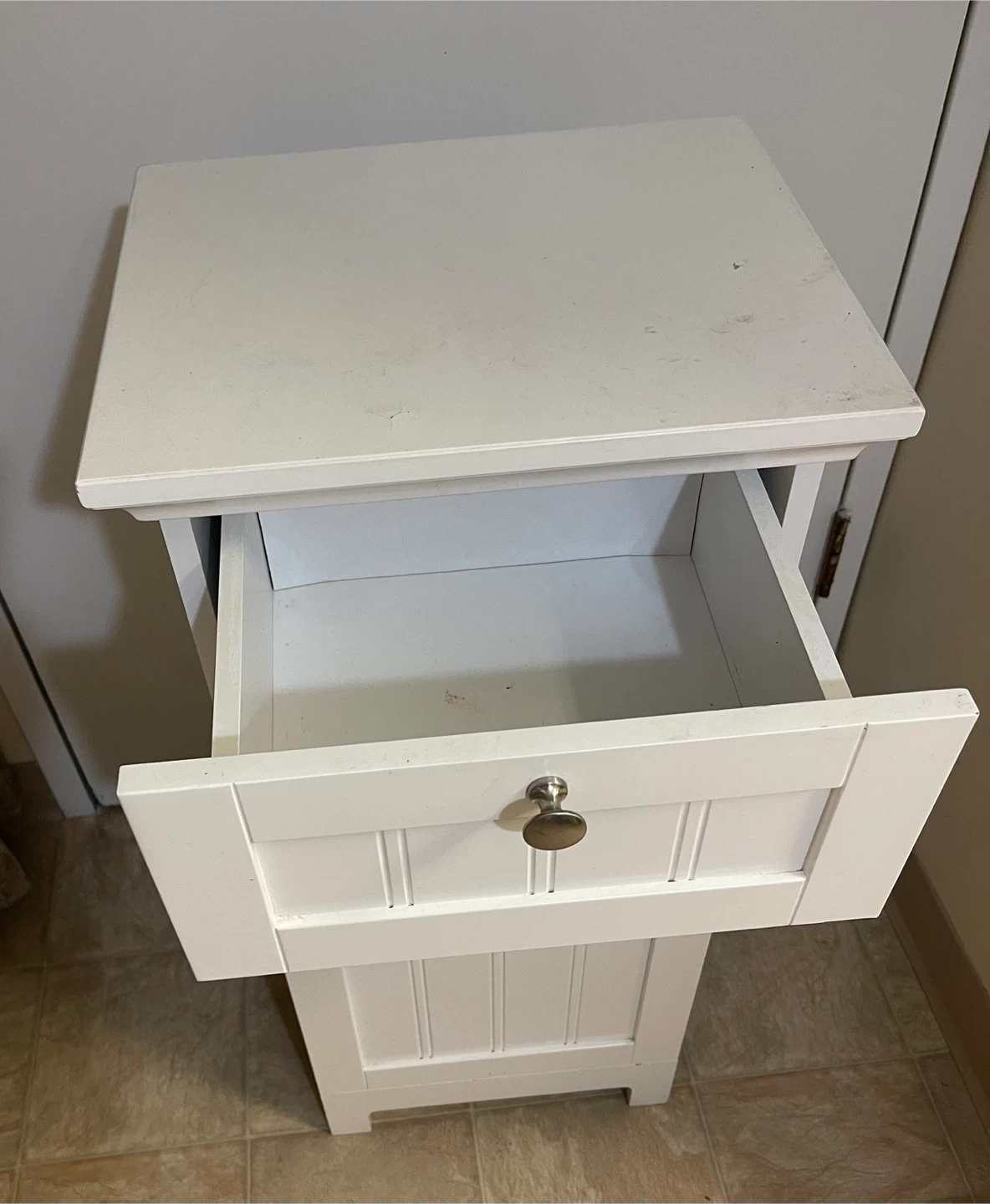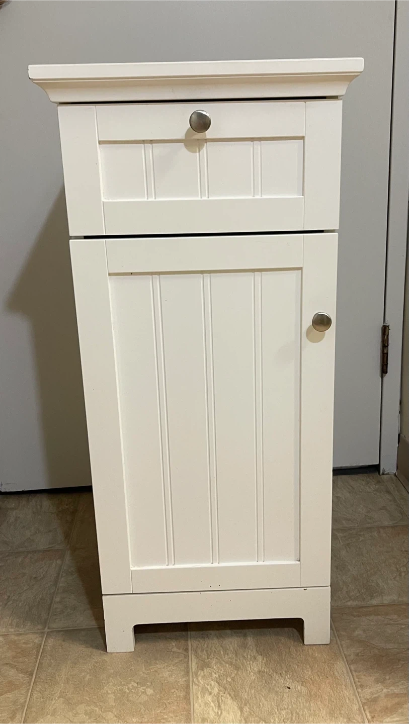 White storage cabinet with one drawer and two shelves. Strong and sturdy. It's made of wood and features a beadboard design on the drawer front and door. Perfect for organizing stuff in a bathroom, kitchen, bedroom, living room, dining room and entrance. It can also be used as a shoe cabinet. Excellent condition. From smoke-free, pest-free, and pet-free home.