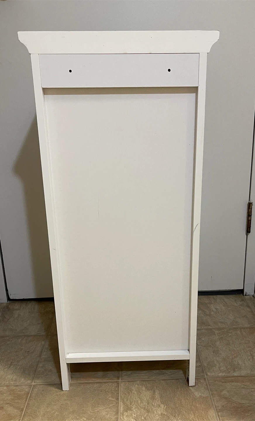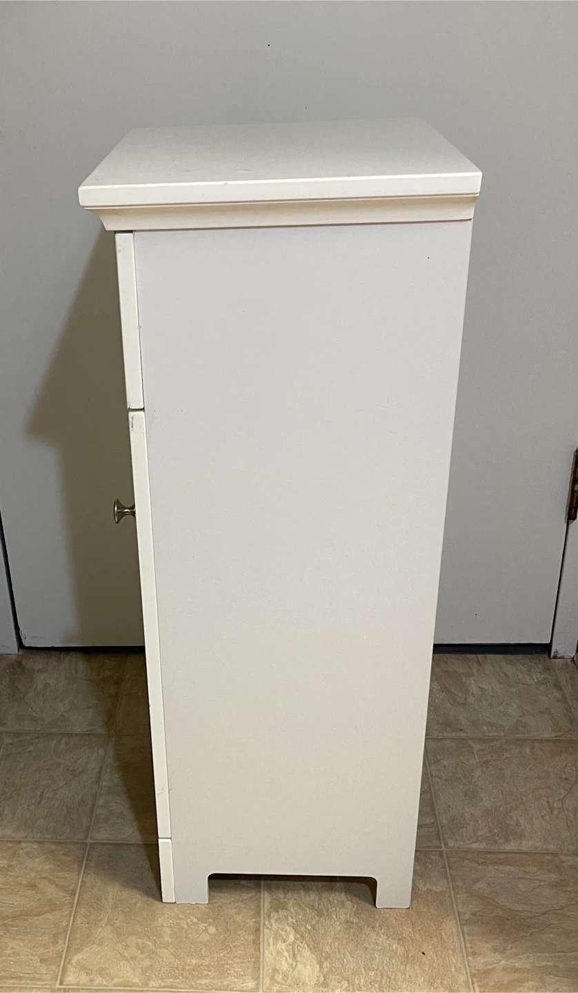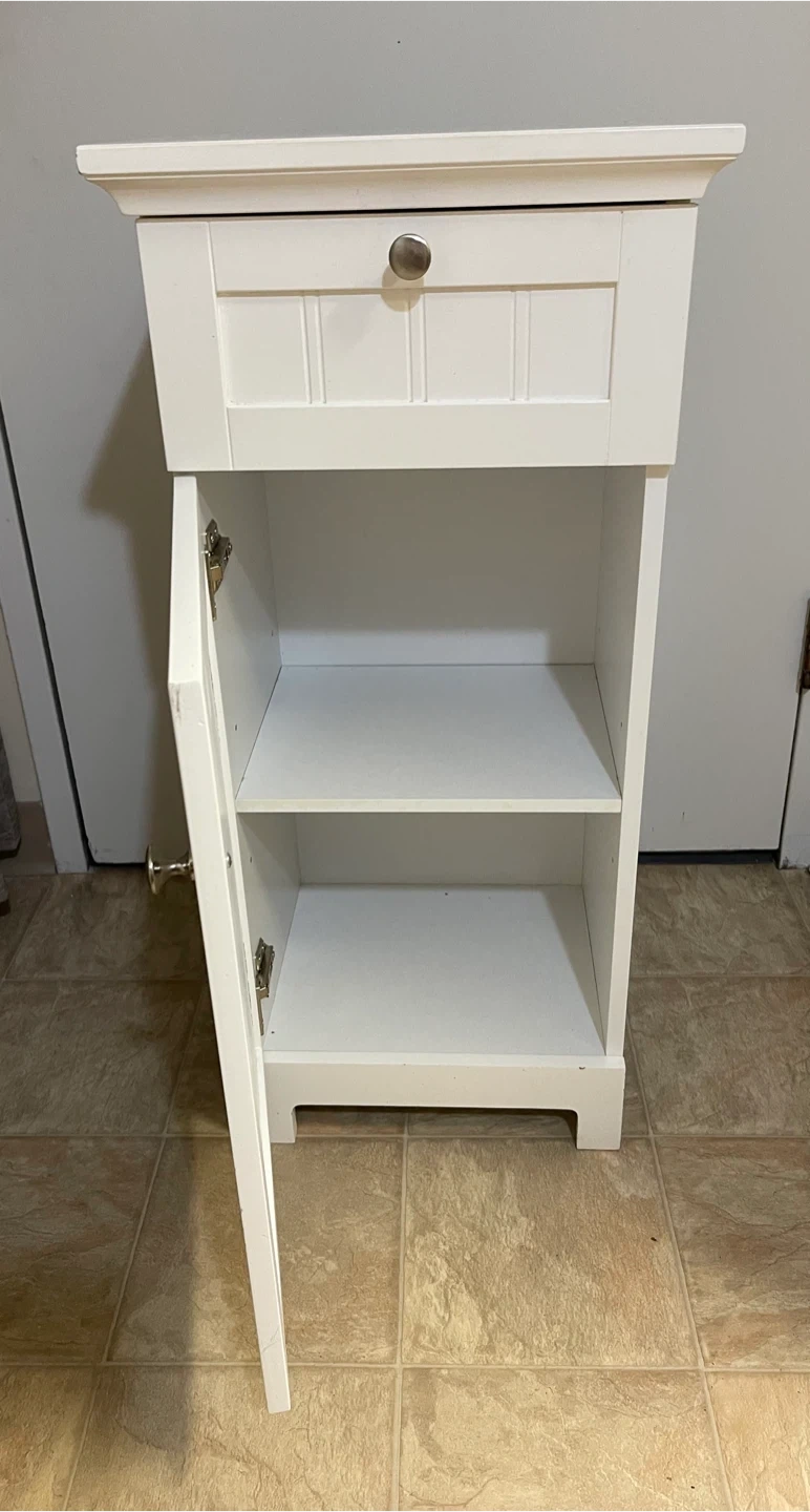 White storage cabinet with one drawer and two shelves. Strong and sturdy. It's made of wood and features a beadboard design on the drawer front and door. Perfect for organizing stuff in a bathroom, kitchen, bedroom, living room, dining room and entrance. It can also be used as a shoe cabinet. Excellent condition. From smoke-free, pest-free, and pet-free home.