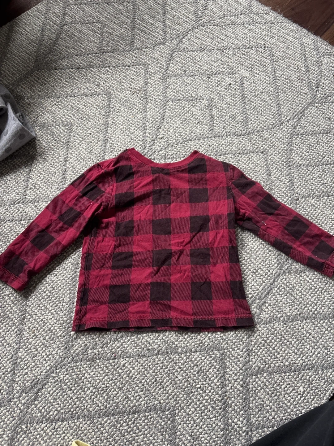 Red and black plaid long-sleeve shirt for toddlers. It's made of a soft cotton blend. This shirt is perfect for everyday wear or as a cozy layering piece.