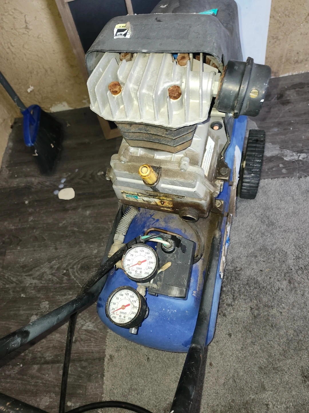 Campbell Hausfeld air compressor with dual gauges. This unit is portable and designed for various workshop tasks. It has a durable blue tank and wheels for easy transport.builds up to 25psi