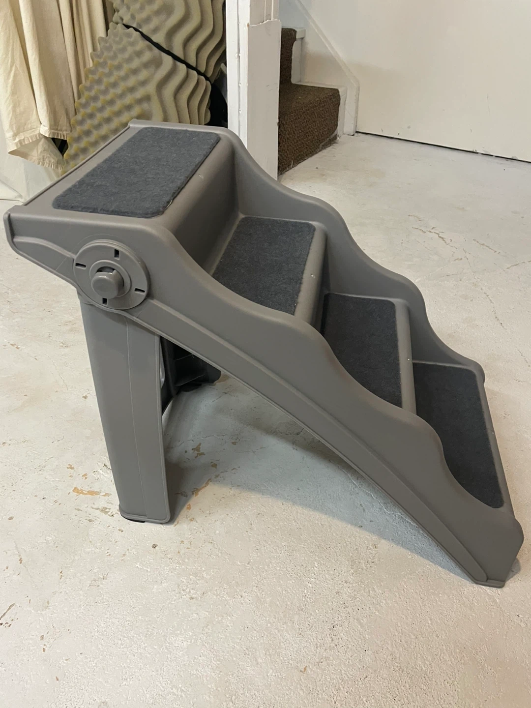 Grey 4-step pet stairs. These stairs are made of durable plastic with carpeted treads for traction. They're great for helping smaller dogs or older dogs get onto furniture or into vehicles. Can support pets up to 150 lbs. Never used!