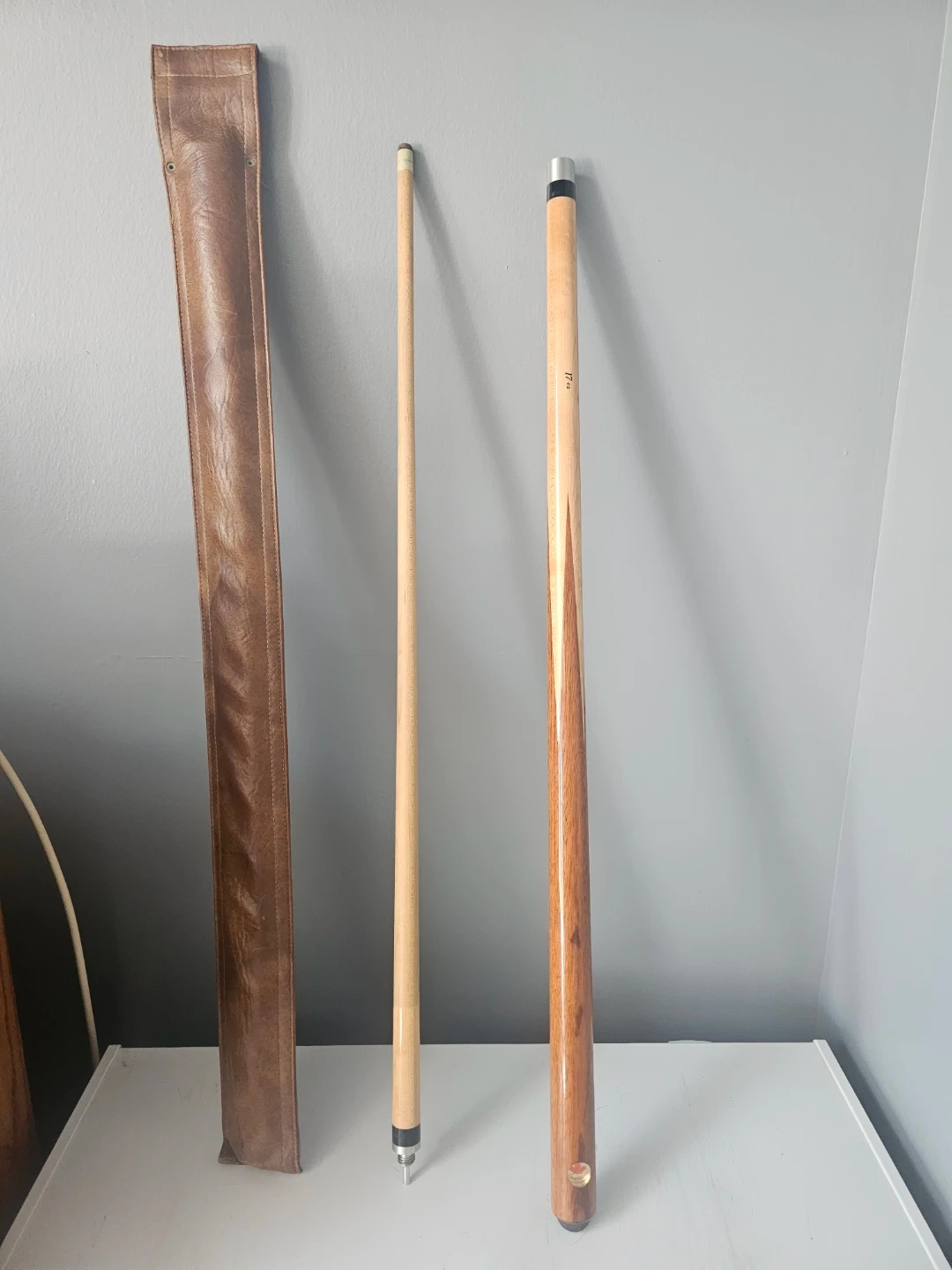This is a Dufferin billiard cue weighing 17 oz. It's made of wood with a leather case for storage. The cue comes with a small accessory pouch, and a logo insert is visible on the butt of the cue.