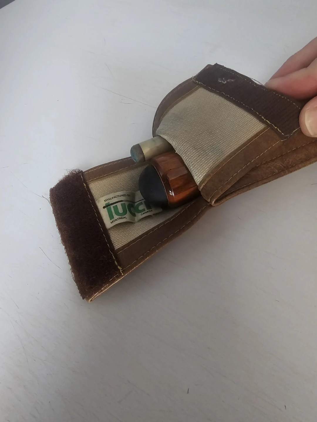 This is a Dufferin billiard cue weighing 17 oz. It's made of wood with a leather case for storage. The cue comes with a small accessory pouch, and a logo insert is visible on the butt of the cue.