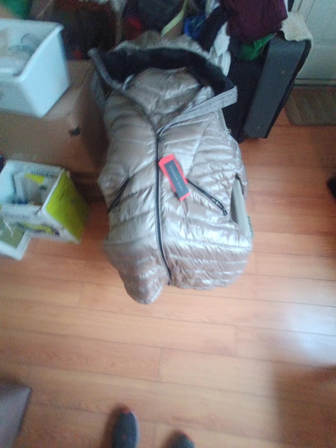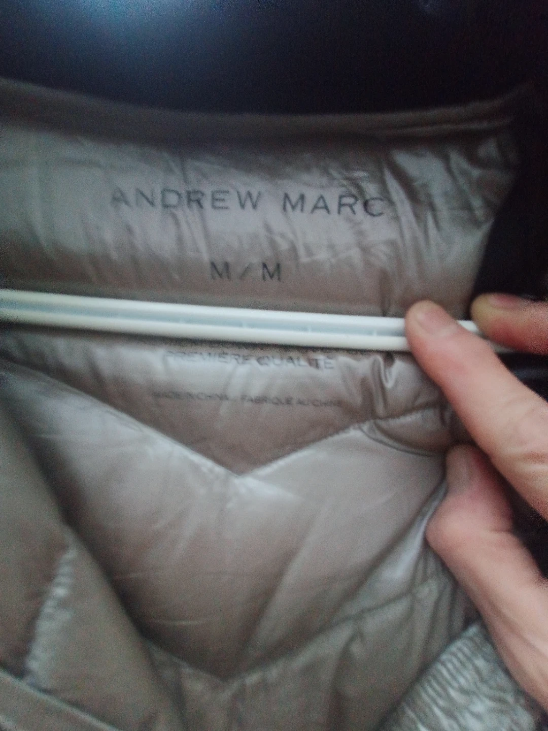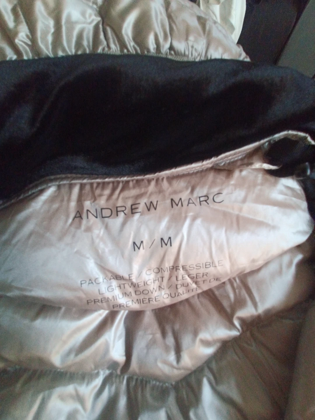 2 shiny champagne-coloured womens puffer jacketst. It has a full zip closure . The brand tag reads 'Andrew Marc.