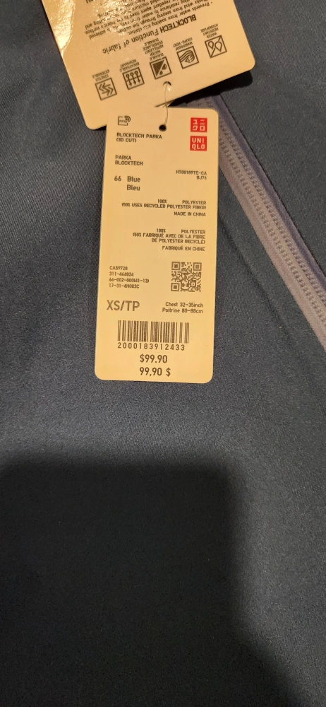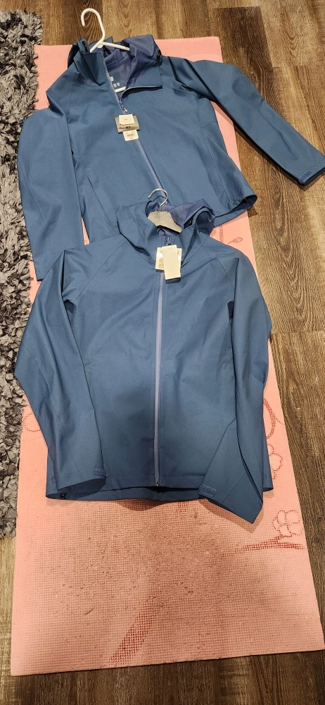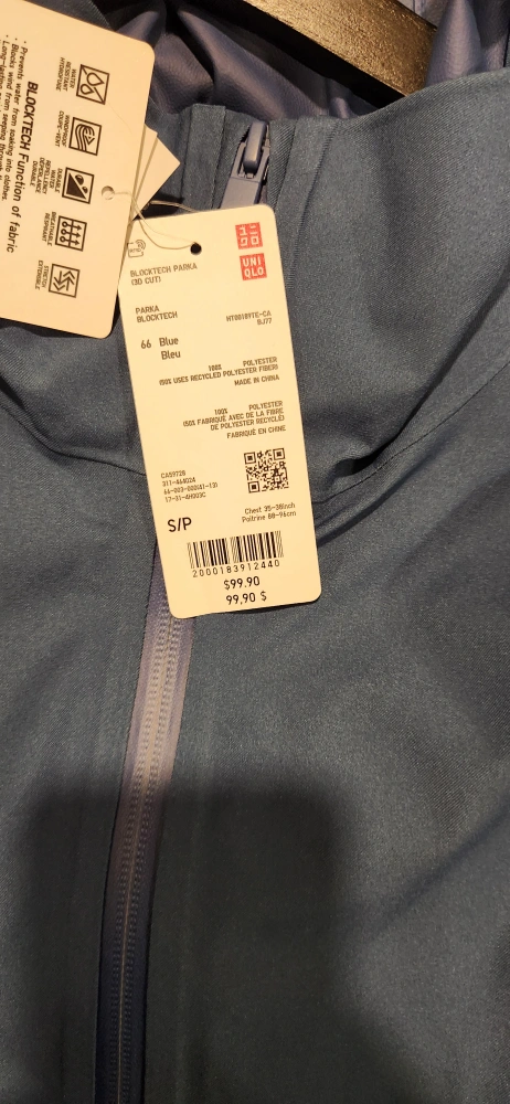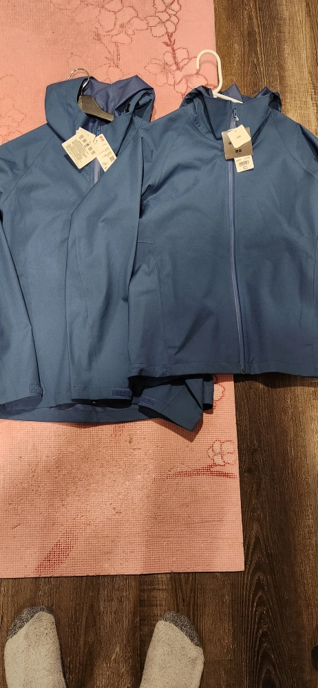 Two UNIQLO Blocktech Parkas for sale. Both are blue. Size XS/TP and S/P available. New with tags. Recycled polyester. Pick up in Orleans.