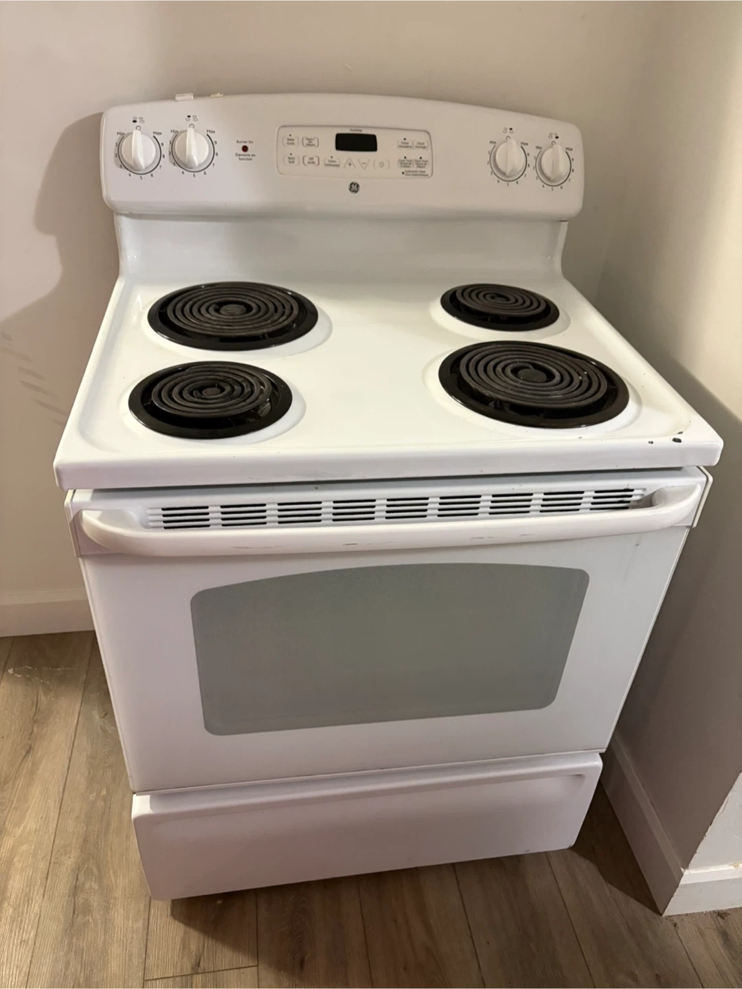 This is a GE white electric stove with four coil burners and an oven. It has a glass window on the oven door for visibility. It's a standard-sized appliance that would fit in most kitchens.