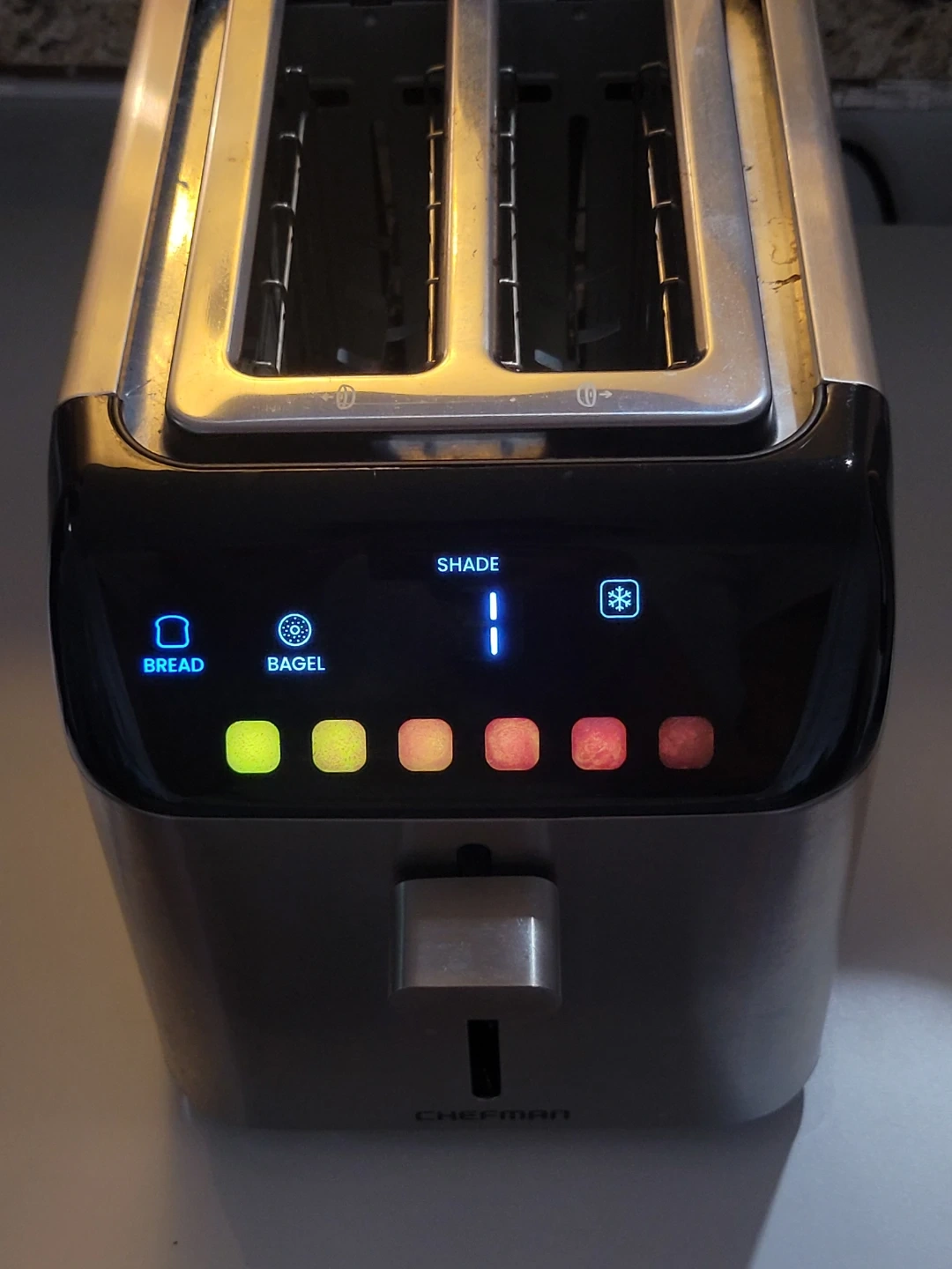 Modern Chefman 2-slice toaster with a sleek stainless steel and black finish.