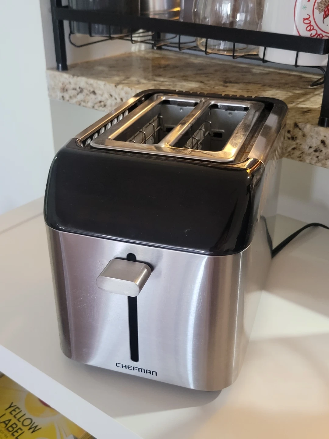 Modern Chefman 2-slice toaster with a sleek stainless steel and black finish.