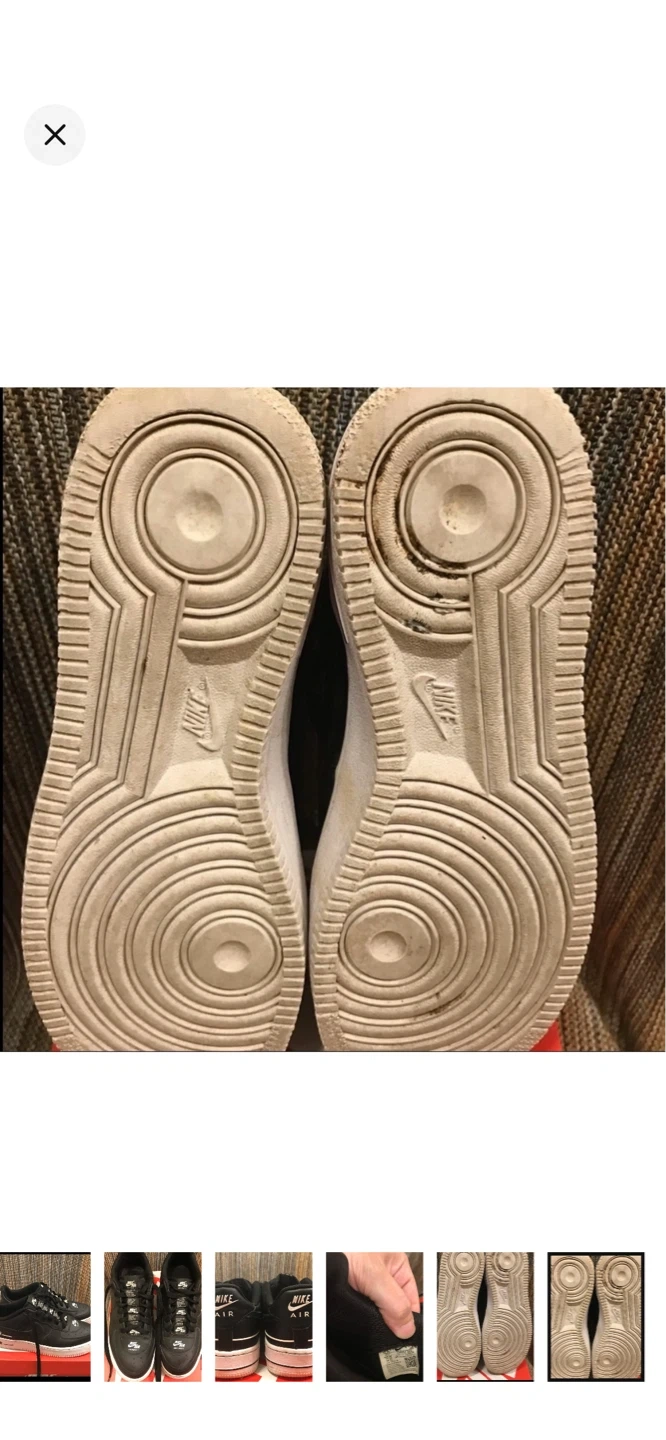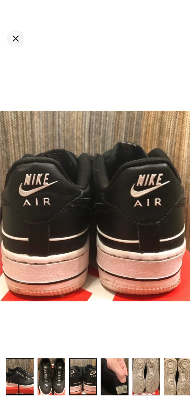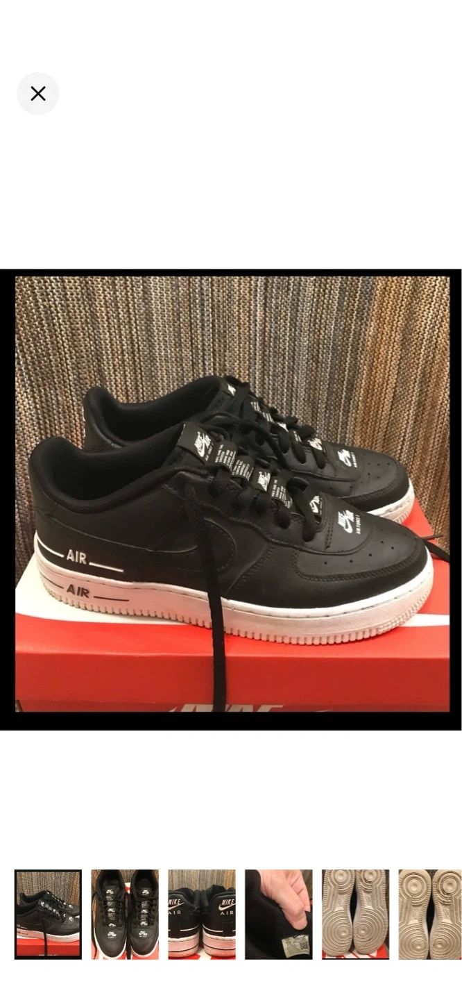These are black Nike Air Force 1 Low sneakers with white accents. They're a classic style with a durable leather upper. Perfect for everyday wear.