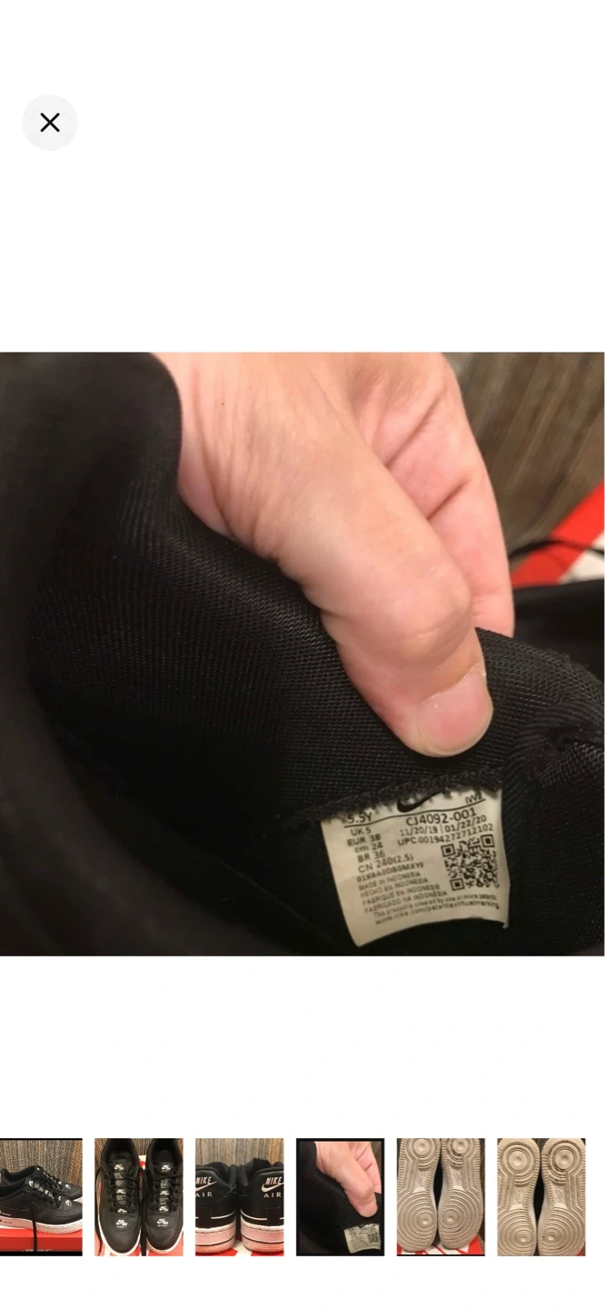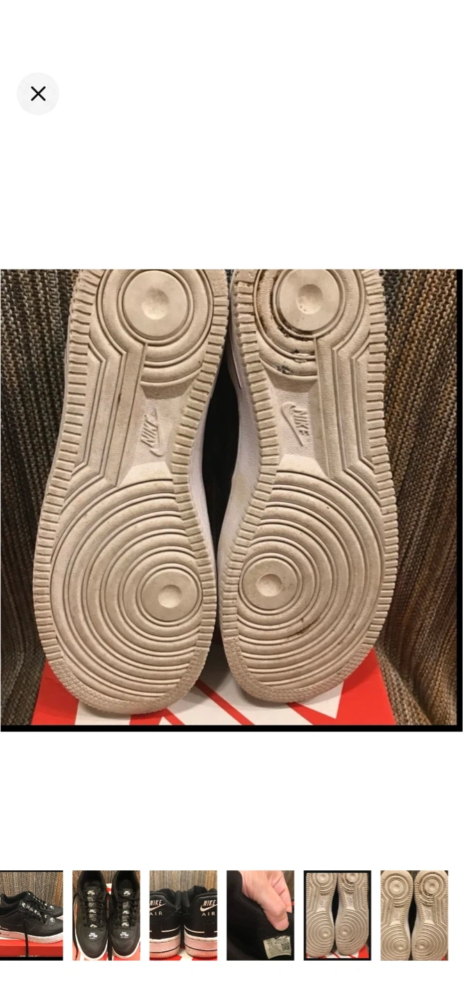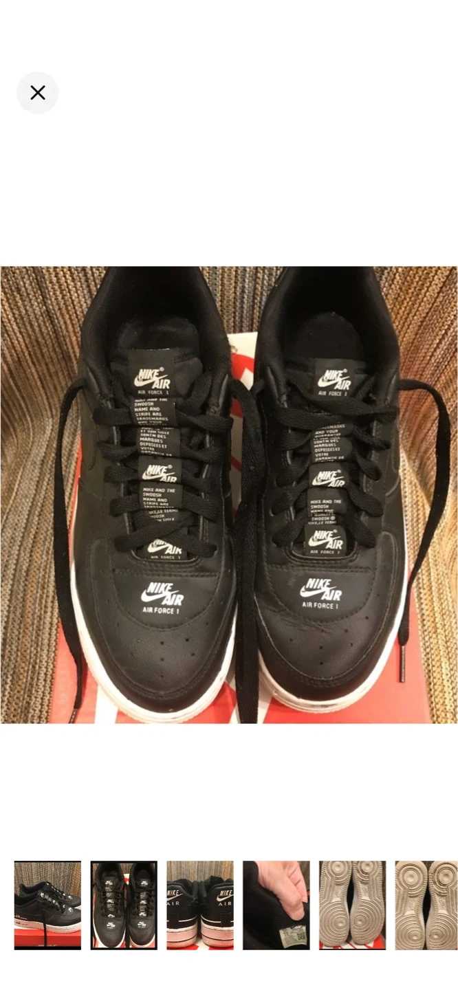 These are black Nike Air Force 1 Low sneakers with white accents. They're a classic style with a durable leather upper. Perfect for everyday wear.
