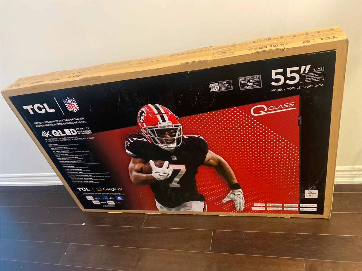 This is a TCL 55-inch 4K QLED Smart TV. It features high brightness and Google TV. It's an official television partner of the NFL.