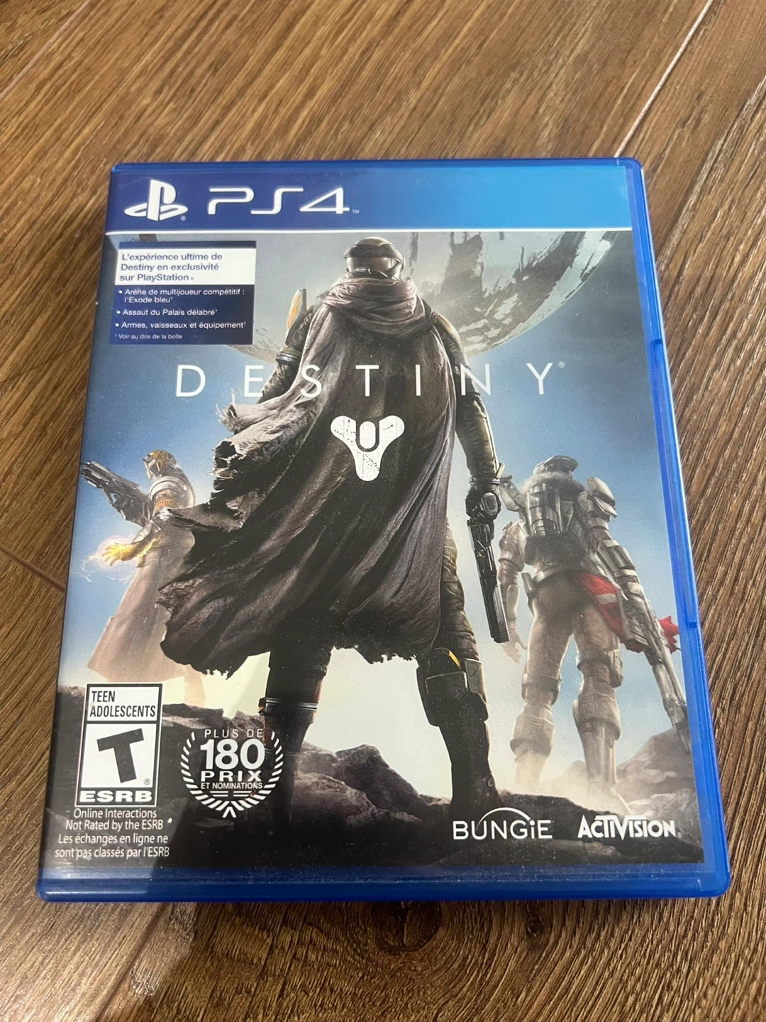 Destiny is a video game for the PS4. It features competitive multiplayer arenas, assaults on derelict palaces, and various weapons, ships, and equipment. The ESRB rating is Teen, indicating it's suitable for adolescents.