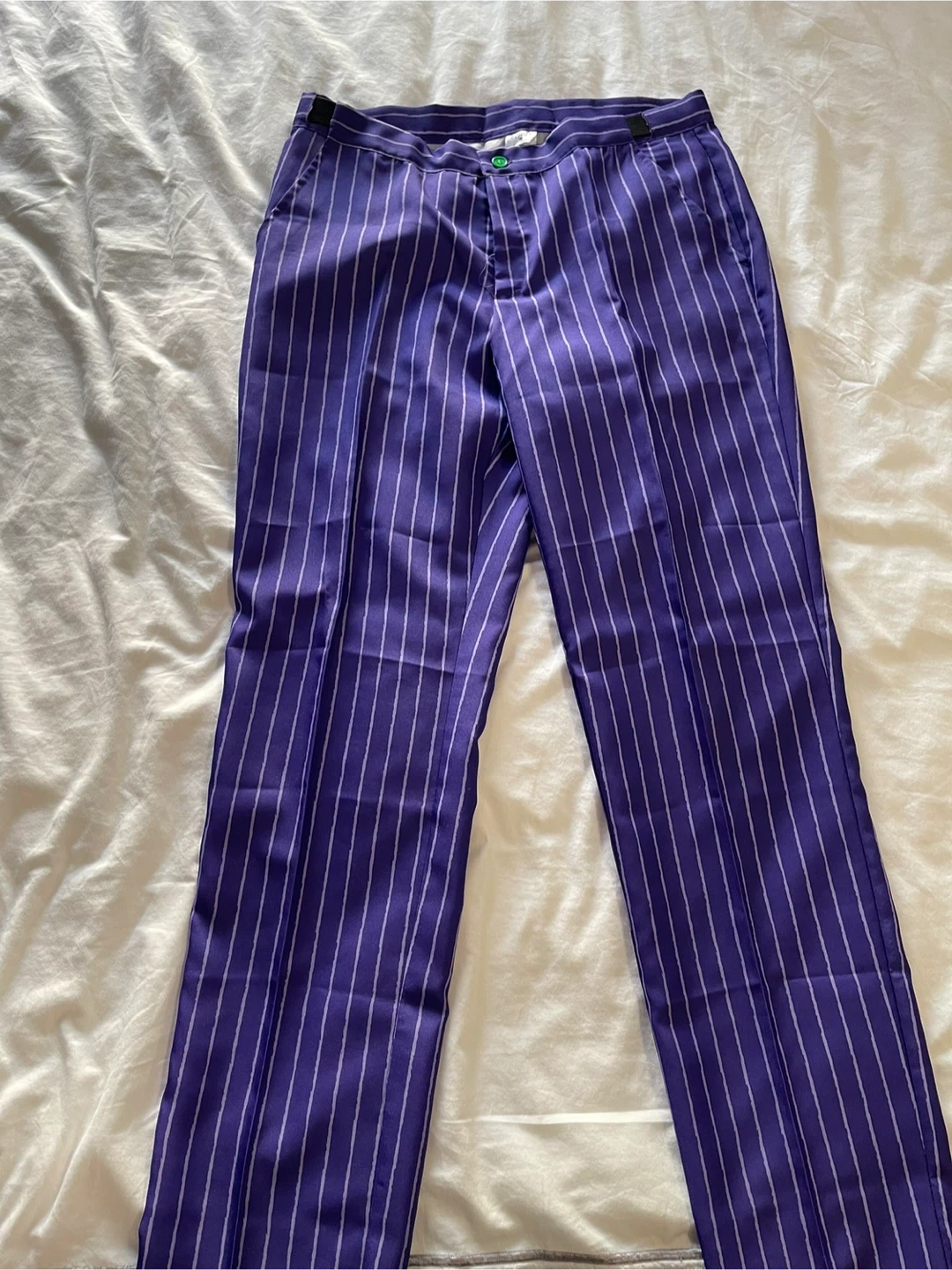 This is a Spirit Halloween Joker costume suit set. It's a size medium with purple pinstripe jacket and pants. The inner lining of the jacket has a green "HA HA" print.