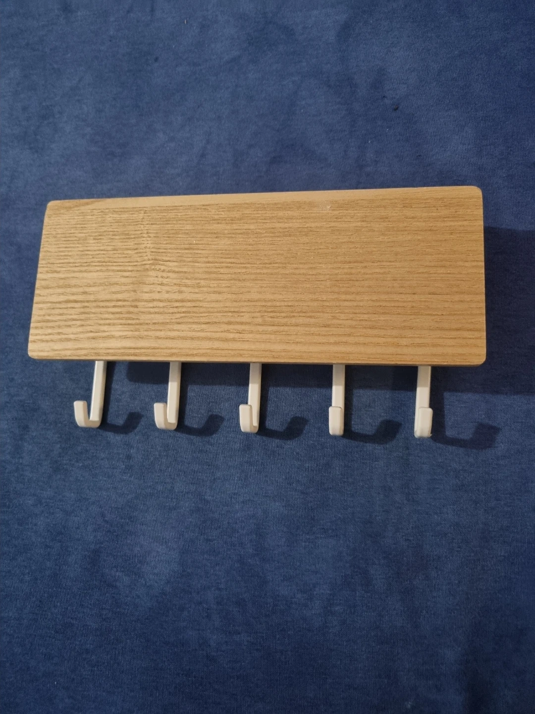 This wall-mounted organizer features a natural wood finish and five white hooks. It's perfect for hanging keys, leashes, or other small accessories by the door. The simple design complements any home decor.