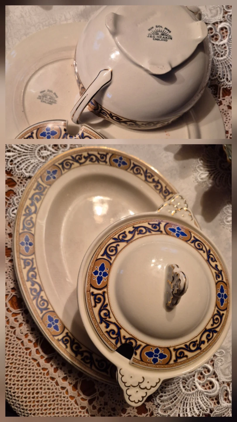 Serving dish made by J&G Meakin, featuring a Sol pattern with blue and gold accents. It's made of porcelain and includes its matching lid. A lovely addition to your dinnerware!