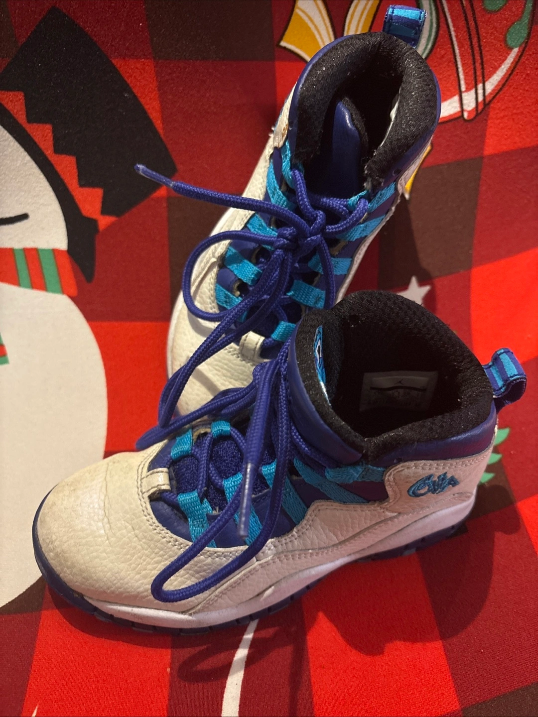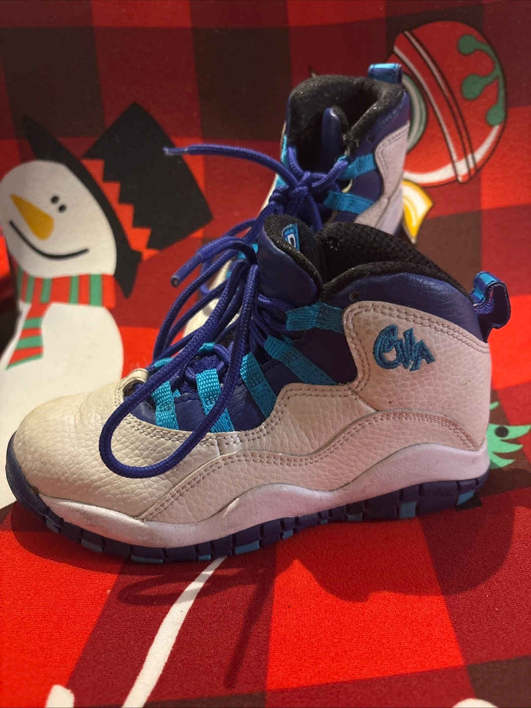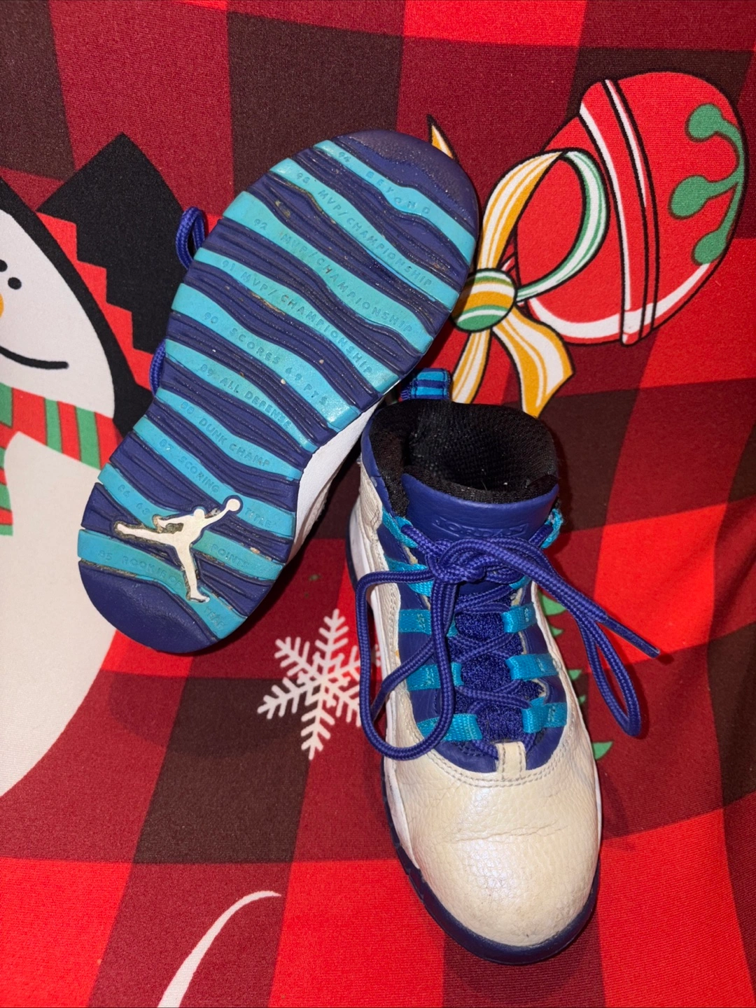 Air Jordan 10 Retro 'Chicago' toddler size. White leather upper with blue and teal accents. Good condition.