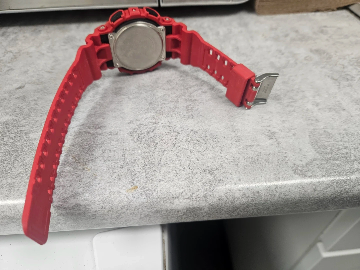 Selling a red Casio G-Shock watch! It's in great condition and ready for a new wrist.