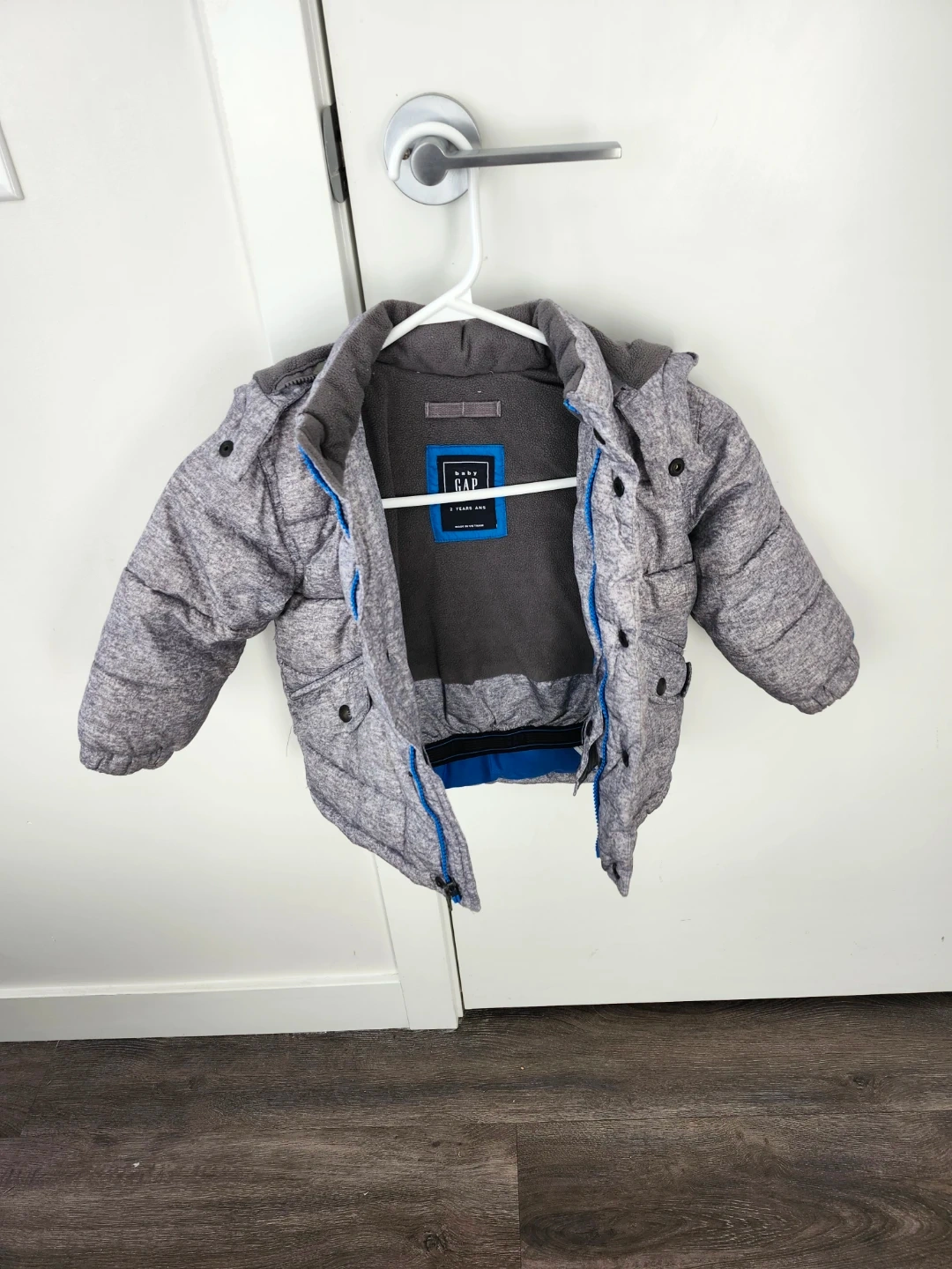 Cozy grey puffer jacket from Baby Gap. Barely worn. Features a full zip closure with snap buttons and a hood. Made with a polyester blend for warmth. Perfect for keeping little ones snug during cooler weather!