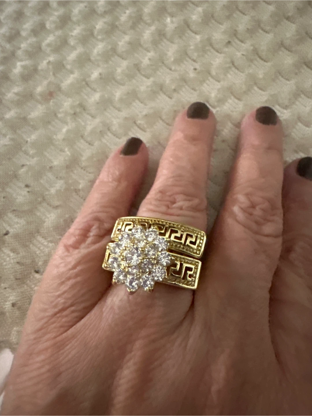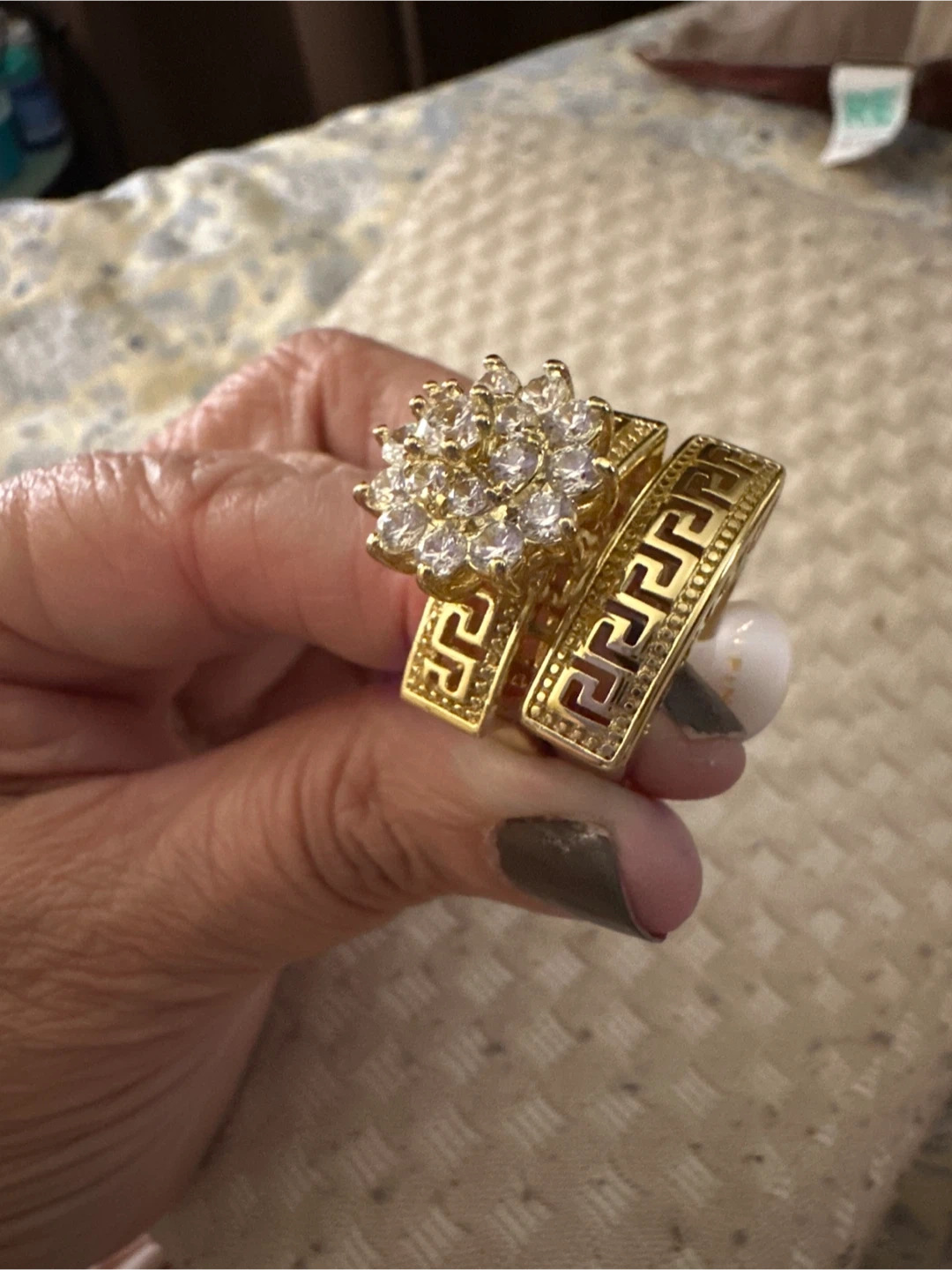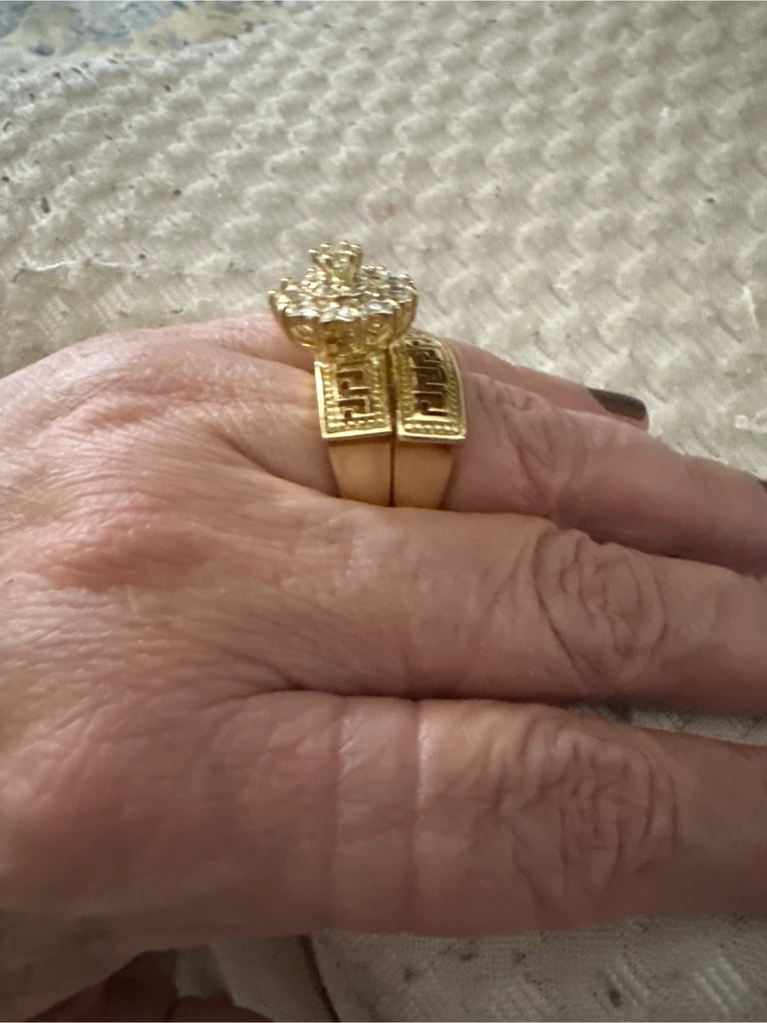 This dazzling ring set features a flower cluster top with clear cubic zirconia stones. It includes a matching band with a Greek key pattern. Gold tone metal construction.