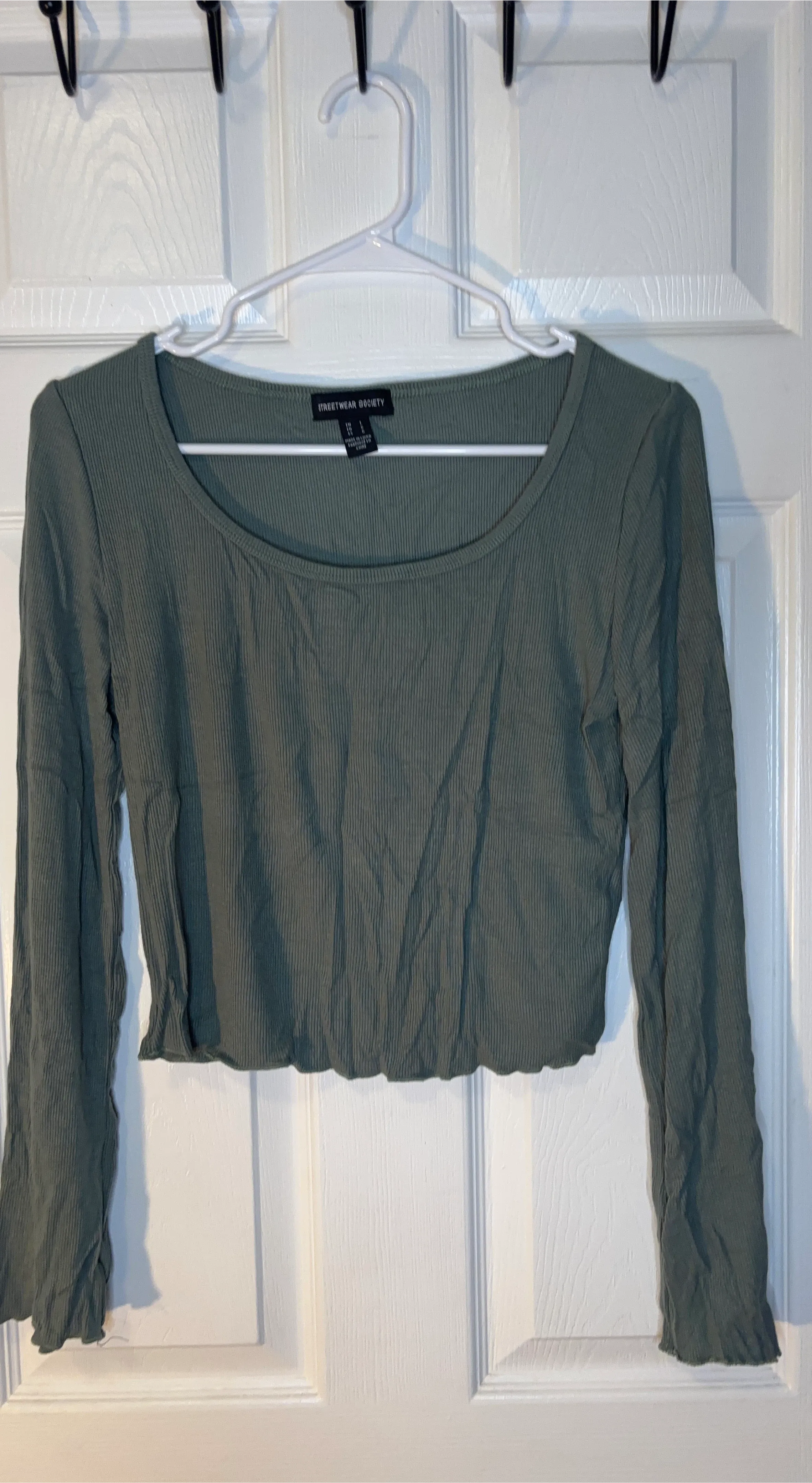 This is a green ribbed long-sleeve crop top from Streetwear Society. It's a size small with a lettuce hem finish. The material is stretchy and comfortable.