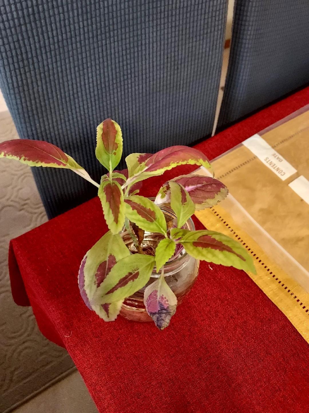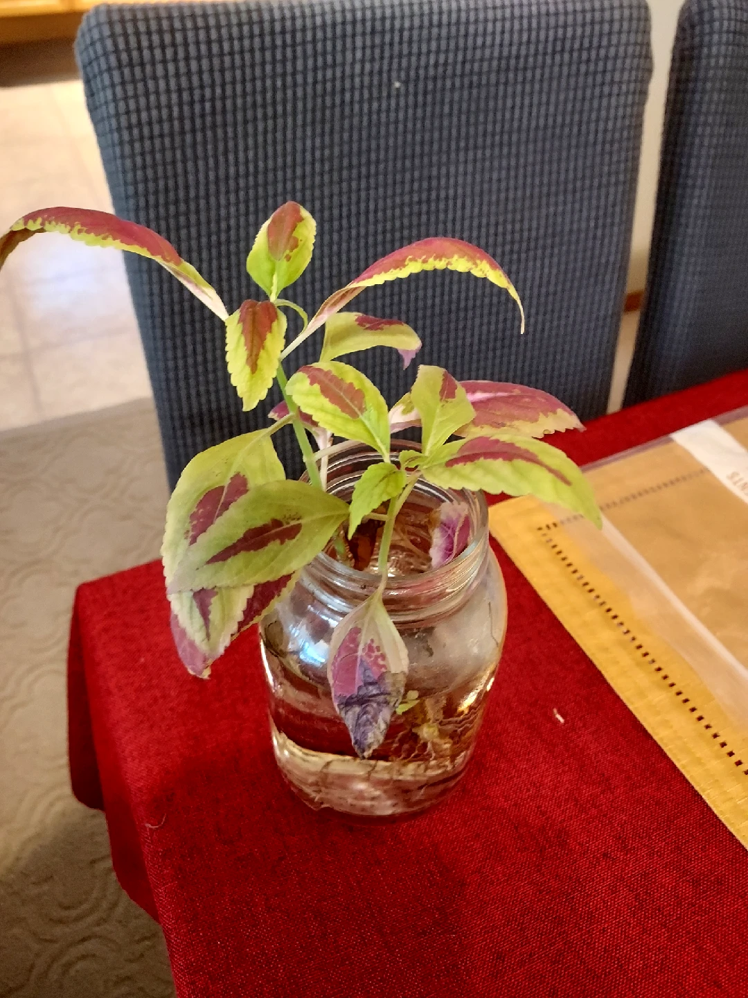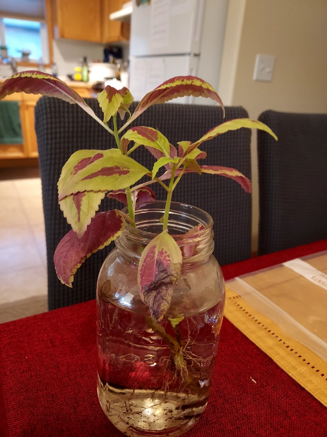 A healthy coleus plant rooted in a glass jar, ready to add some colour to your home! The leaves have a lovely mix of green and burgundy