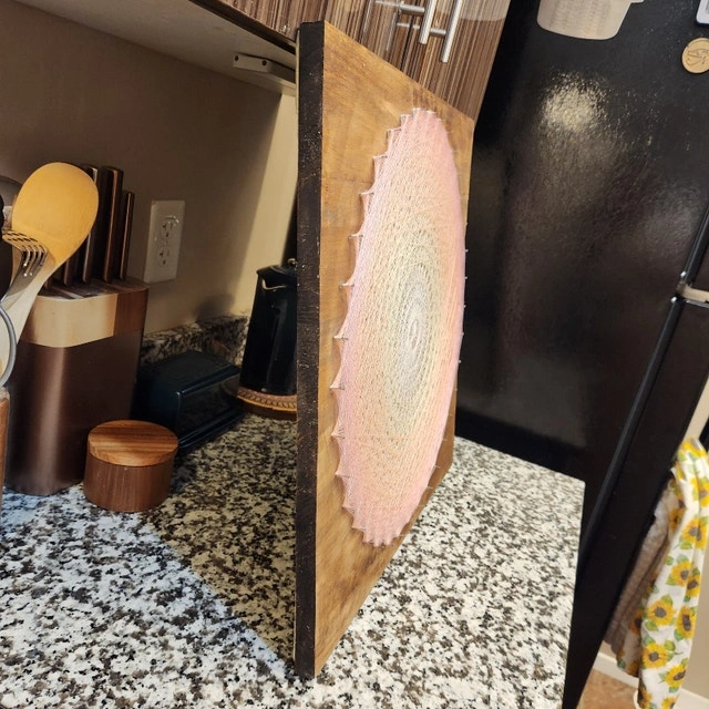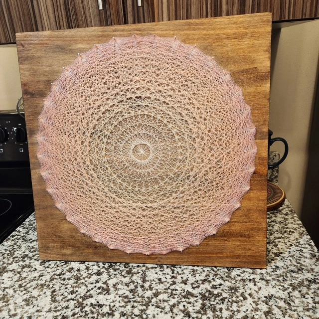 Original String Art on Wood by Sista Bea, artist from Granada, Spain. Features Sacred Geometry: Círculos Rosas. Dimensions: 19.25” L, 0.60” W, 19.50” H. Originally $300 + Shipping. Selling for $160. Price is firm and non-negotiable. Cash only. Pick up in Allard, SW Edmonton. Condition: Used - Good.