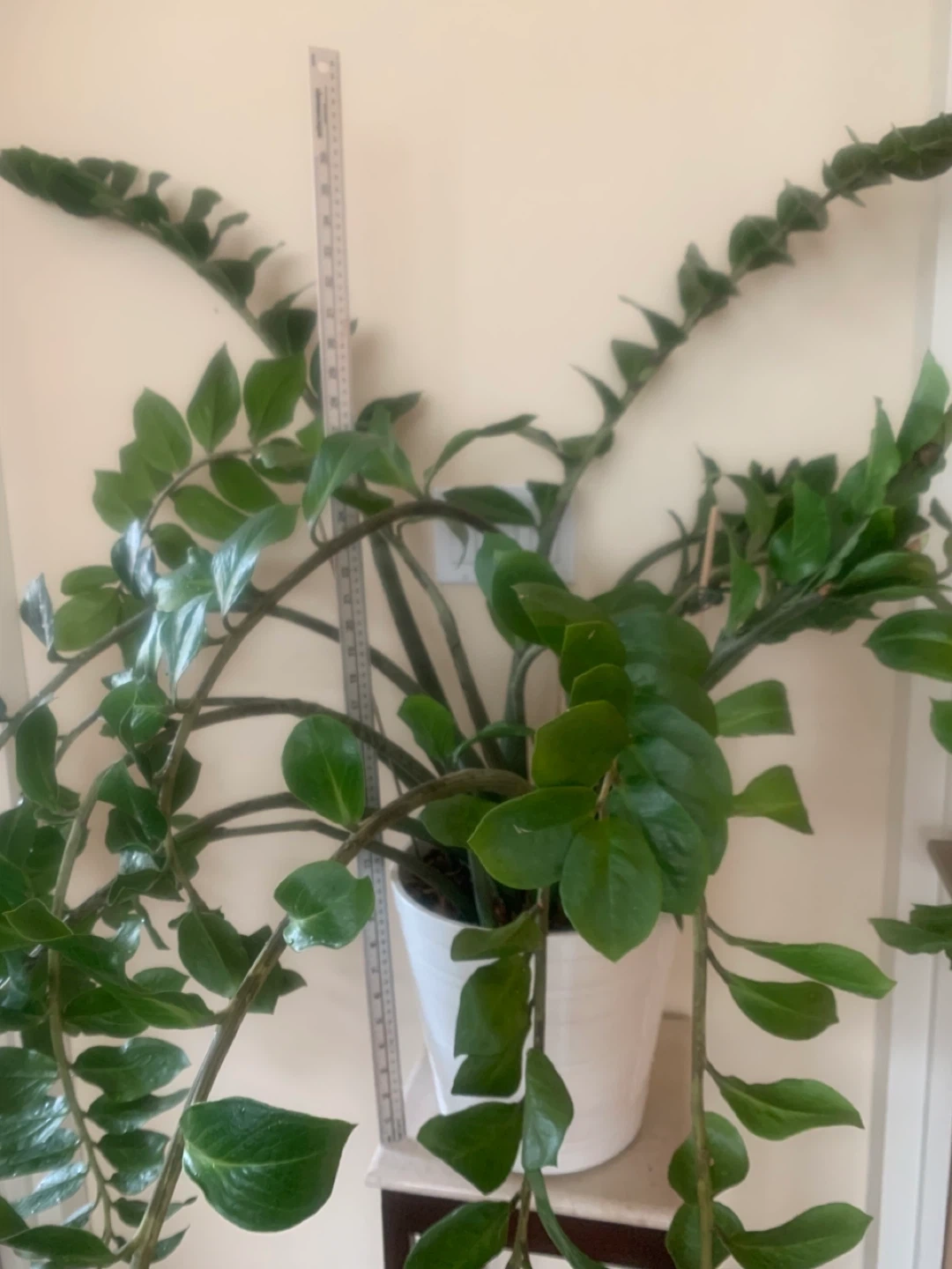 Healthy and spectacular 20 years old ZZ plant has thick green waxy leaves and multiple long stems. Plant is in white ceramic pot 11” tall and 11” diameter.