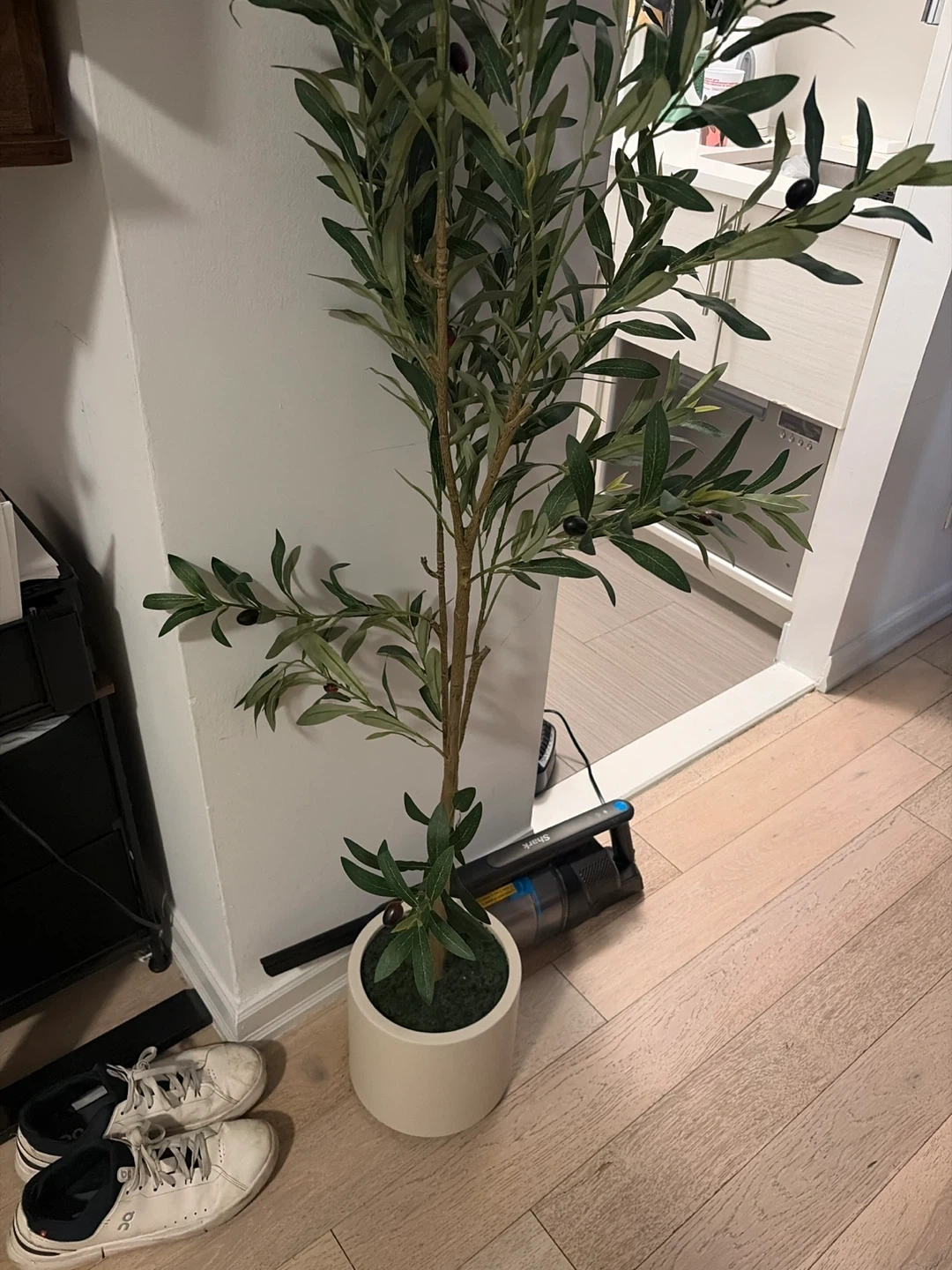 This is a tall, artificial olive tree plant in a cream-colored pot. It has realistic green leaves and black olives, bringing a touch of Mediterranean charm to your space. The plant stands potted and ready to place.